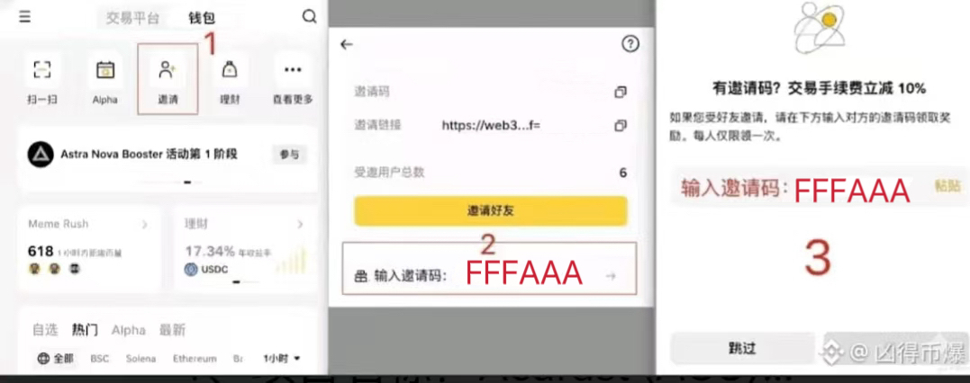 币安钱包开始收费了,填我的邀请码 FFFAAA 可以帮兄弟们省30%手续费(全网最高),系统返佣自动到账,重点是刷Alpha、打狗、刷交易赛、链上合约,买股票等都能返30%!已经在使用的老账户也能填的,具体操作如下: