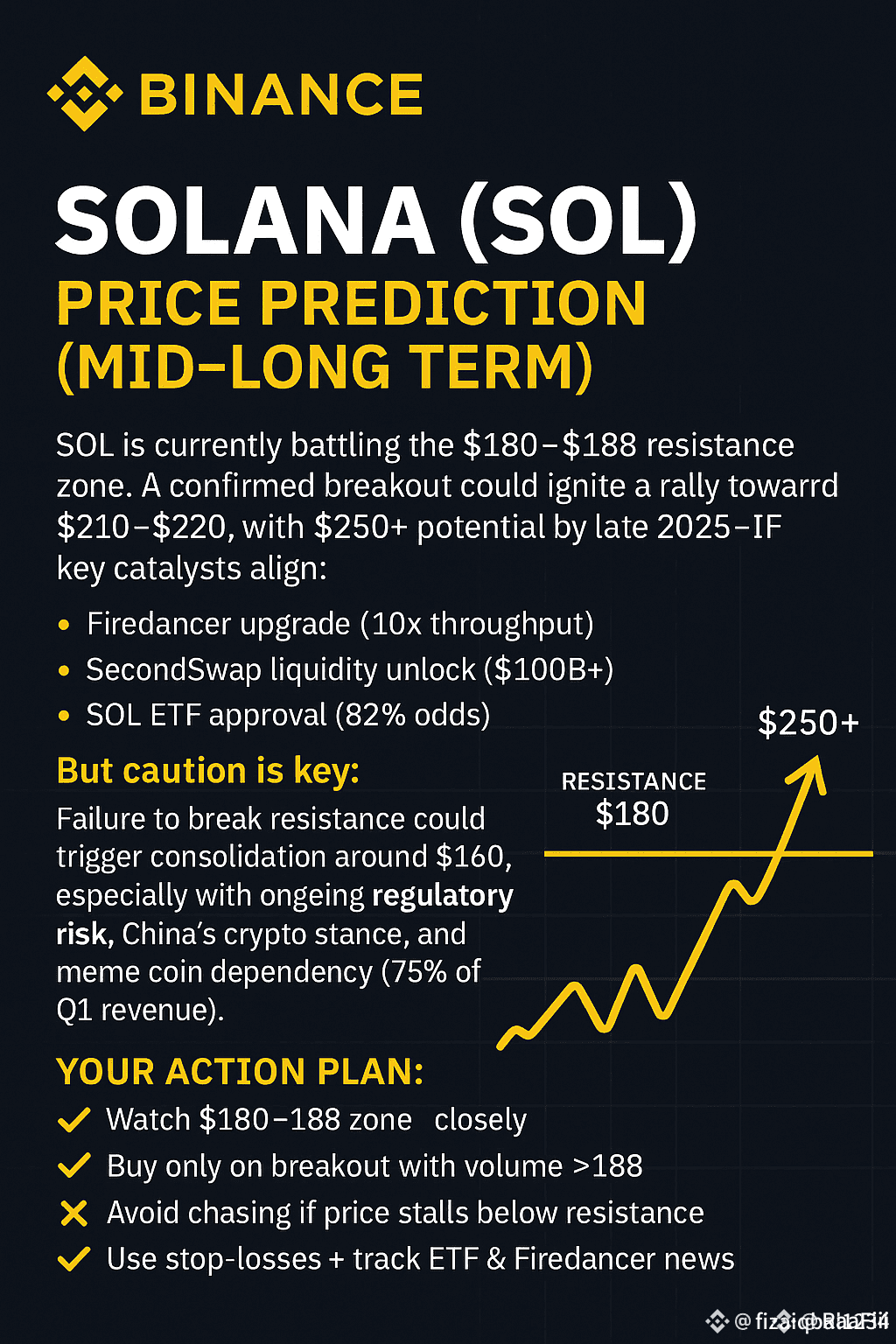 SOL sta attualmente testando la zona di resistenza $180–$188. Un breakout confermato potrebbe innescare un rally verso $210–$220, con potenziale oltre $250 entro la fine del 2025 se i catalizzatori chiave si allineano: