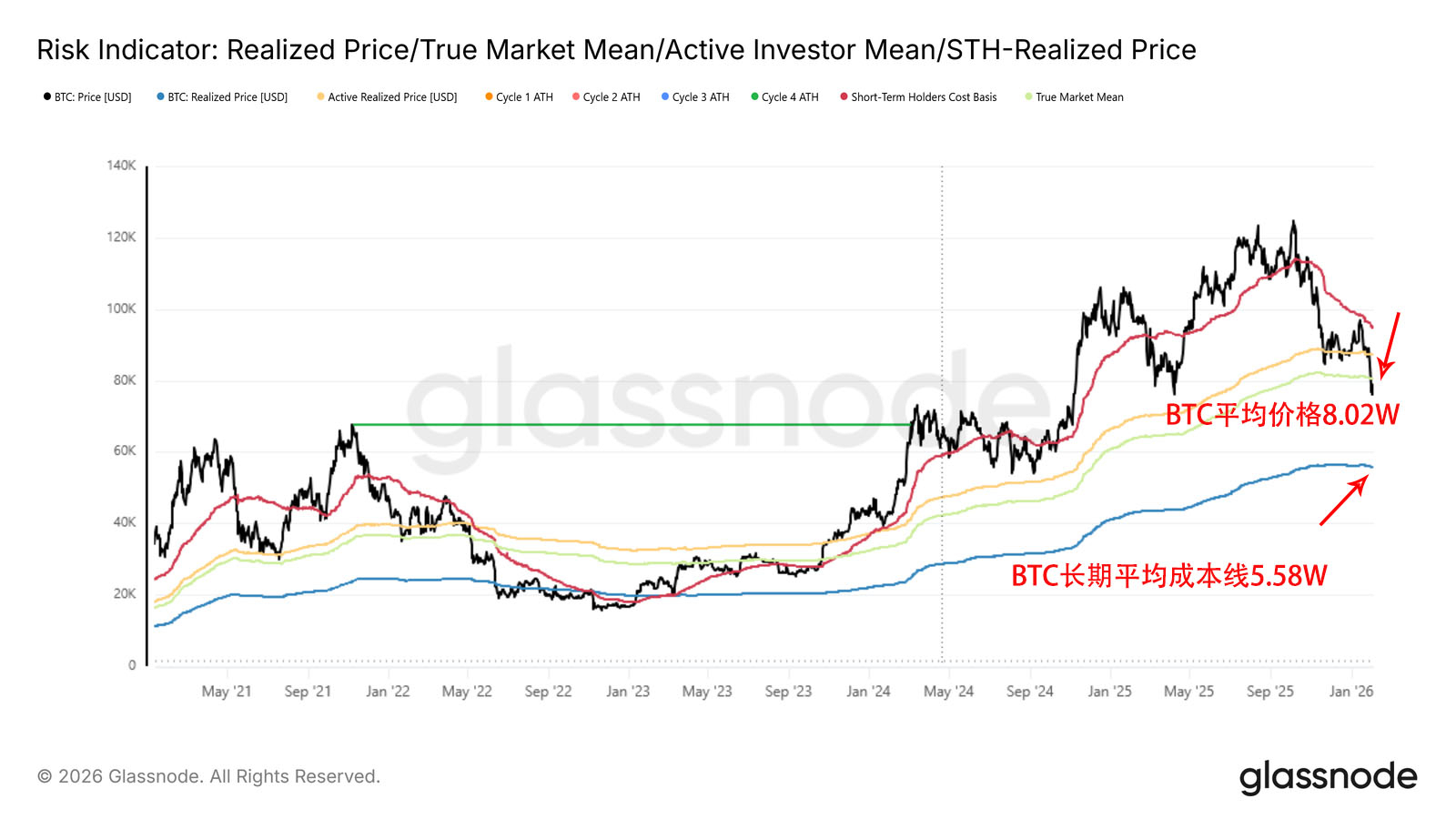 · 已实现市值(Realized Cap) 死守1.1万亿美元高位,这是个关键信号。它意味着市场整体的成本基础依然很高,并未发生类似2022年那种全面的资本大逃亡。多数人只是“被套”,而非“割肉”。