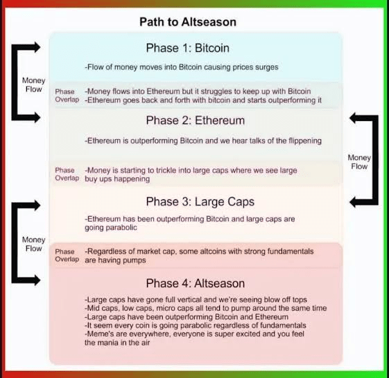 * Fase II: Ethereum (ETH) e Alts a Grande Capitalizzazione: Man mano che l'apprezzamento del prezzo di Bitcoin si stabilizza, il capitale inizia a ruotare verso Ethereum e altri Layer-1 e protocolli DeFi consolidati e ad alta capitalizzazione di mercato.