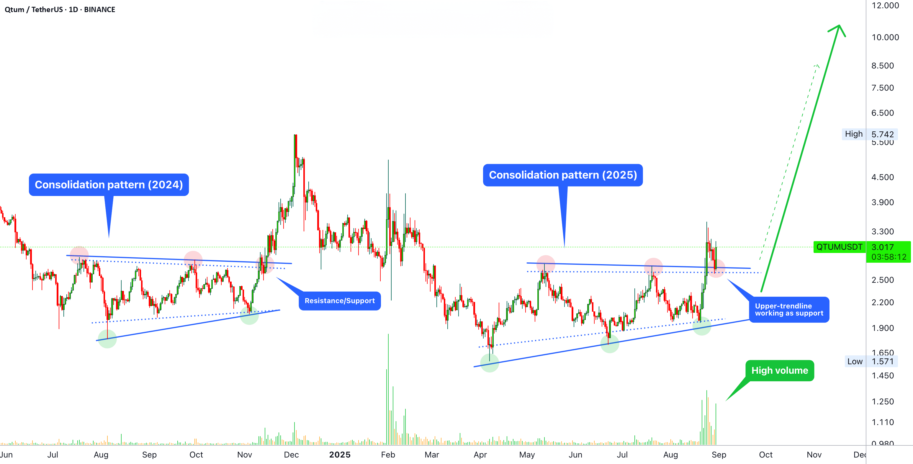 Questo è lo stesso grafico che abbiamo visto centinaia di volte prima, ma qualcosa è diverso. QTUMUSDT non sta più negoziando all'interno della "zona di acquisto opportunità". Guardalo. QTUM non sta negoziando a prezzi minimi. Quindi, lo stesso, ma i prezzi sono più alti.