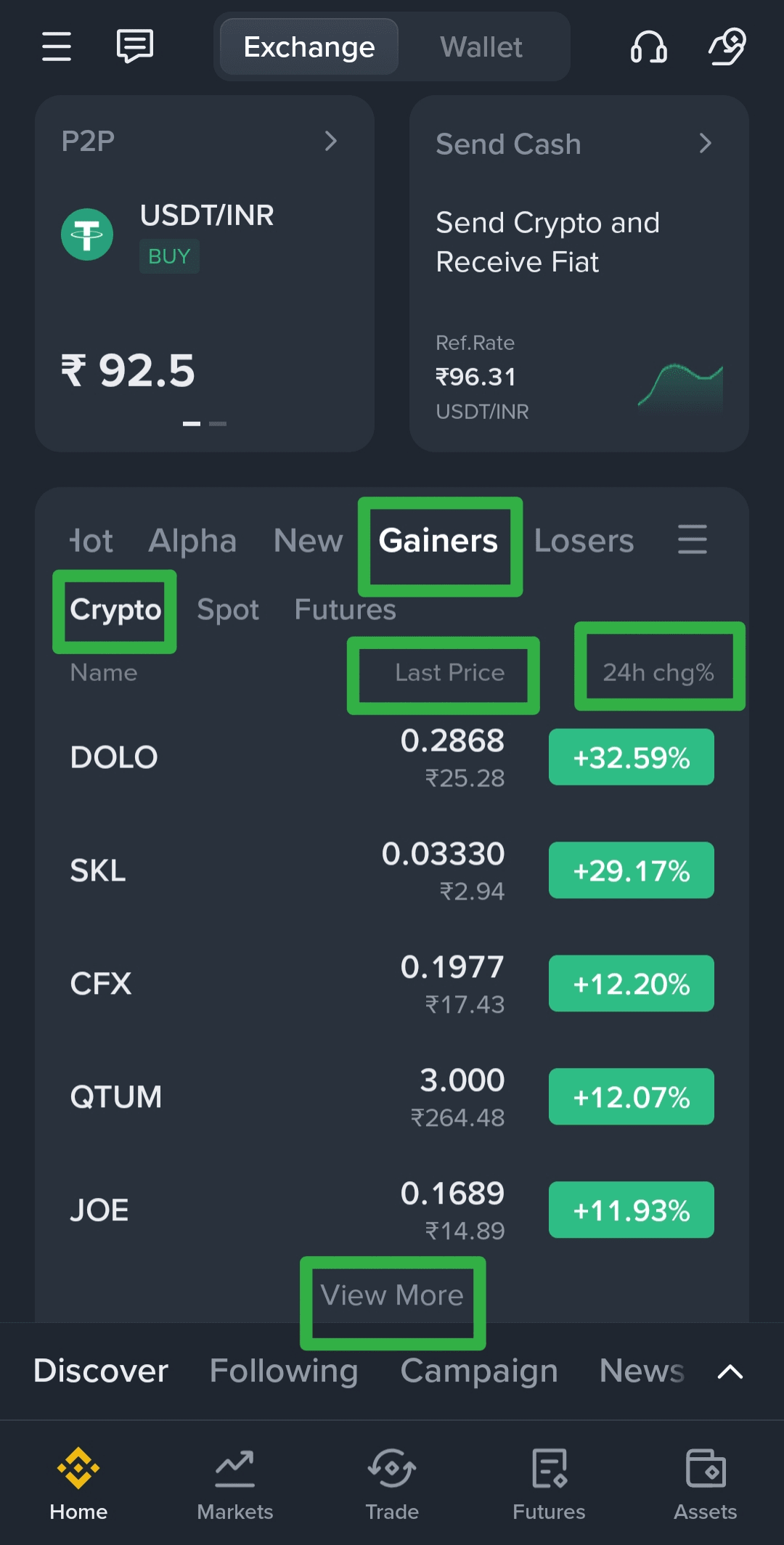 Se vuoi vedere più opportunità, tocca semplicemente Visualizza di più in fondo alla sezione Gainers per esplorare ulteriori monete.