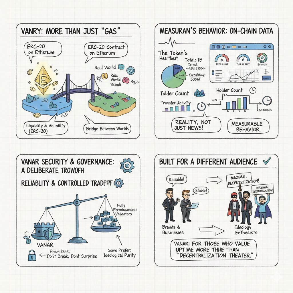 The token side is also more practical than people make it sound. VANRY isn’t just “gas.” It’s also the bridge between worlds, because the ERC-20 contract on Ethereum is where a lot of liquidity and visibility live. And the on-chain data gives you a reality check that doesn’t depend on announcements: supply parameters, holder count, transfer activity — that’s the heartbeat of how widely distributed and actively used the token is. It’s not “news,” it’s measurable behavior.