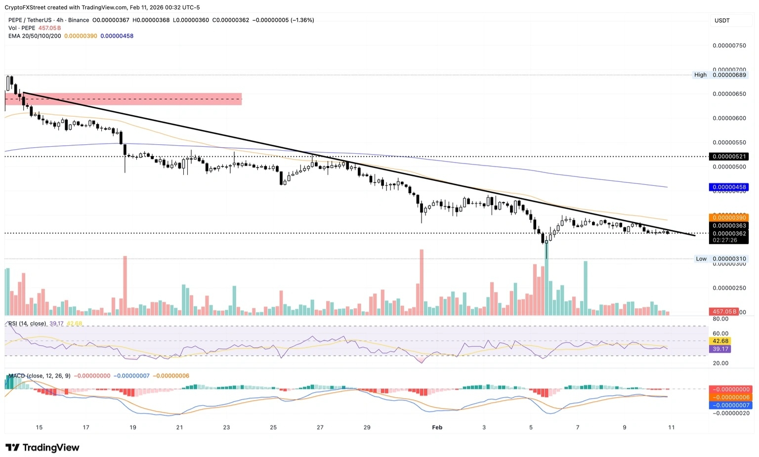 On the 4-hour chart, the frog-themed meme coin is reversing from a resistance trendline toward the February 6 low at $0.00000310.