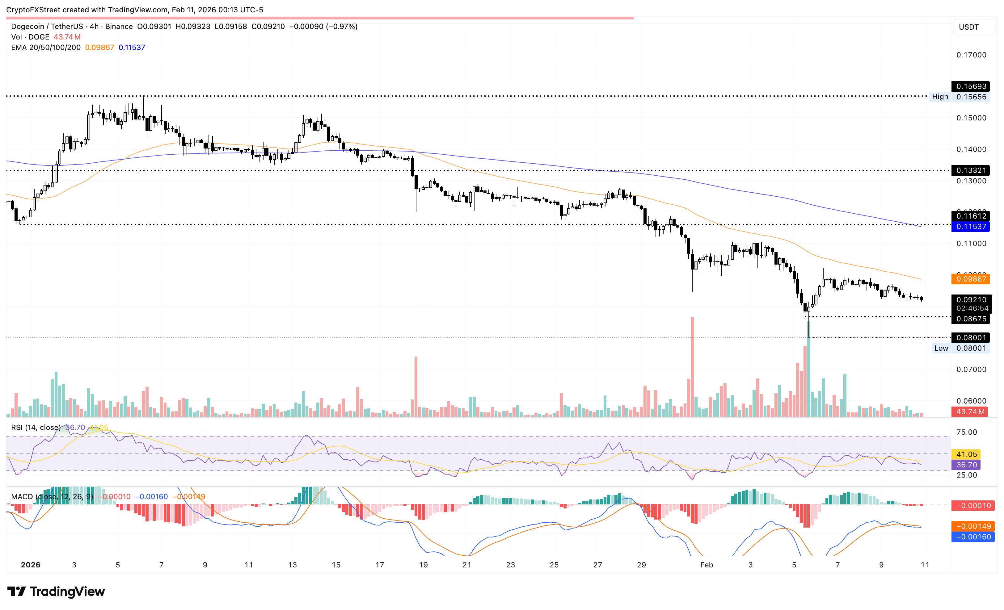 Dogecoin is down nearly 1% at press time on Wednesday, extending its 3% loss from the previous day. On the 4-hour chart, Dogecoin is trading well below the 50-day and 200-day exponential moving averages, reinforcing the downside bias.