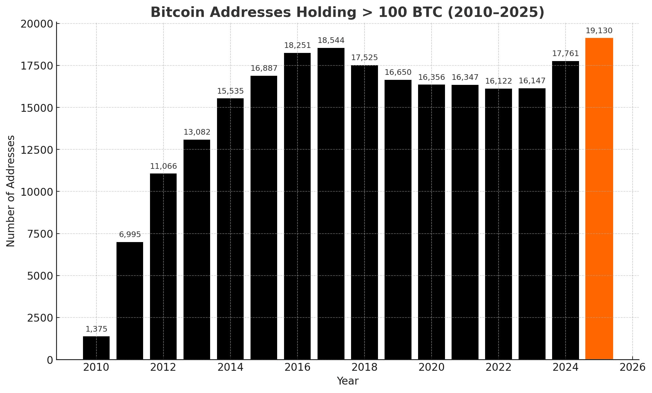 Il mondo di Bitcoin continua a vivere un'evoluzione affascinante. Secondo dati recenti on-chain, il numero di indirizzi Bitcoin che detengono più di 100 BTC è balzato a 19.130 nel 2025, segnando un massimo storico e segnalando un crescente accumulo di balene nel mercato crypto.