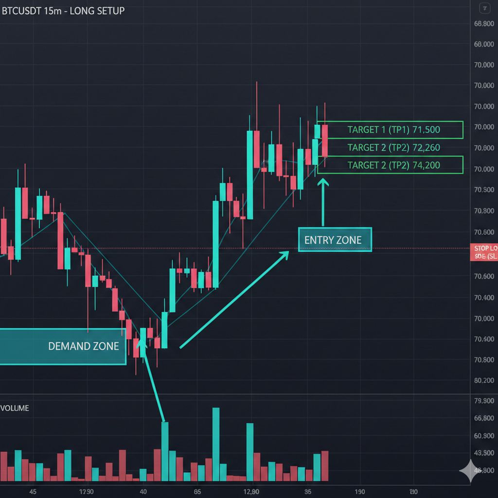 Attualmente, il prezzo si sta consolidando nell'area 70.400–70.600, che funge da base di continuazione sana. Finché BTC rimane sopra questa zona, la struttura rialzista rimane intatta. Questa consolidazione rappresenta forza, non debolezza, e aumenta la probabilità di continuazione verso livelli di resistenza più elevati.
