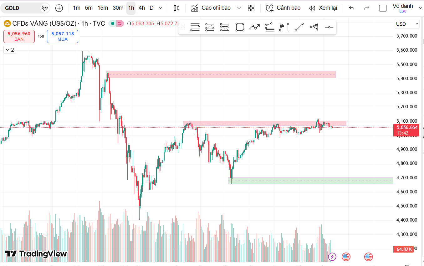 🔴 Kháng cự mạnh 5,080 – 5,120 (vùng phân phối gần nhất) 5,400 – 5,450 (đỉnh cũ xa hơn)