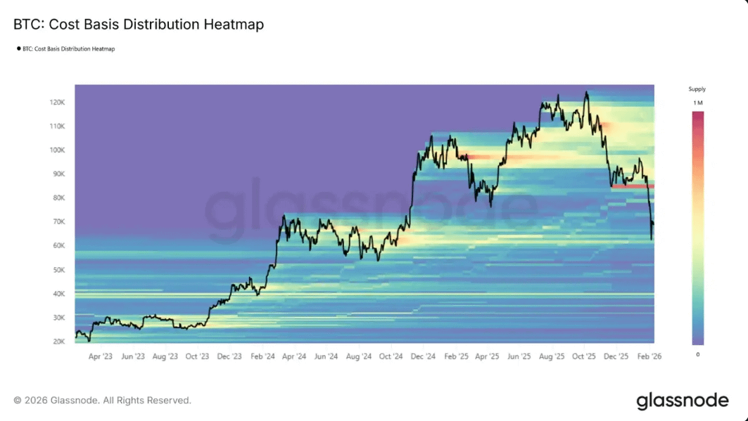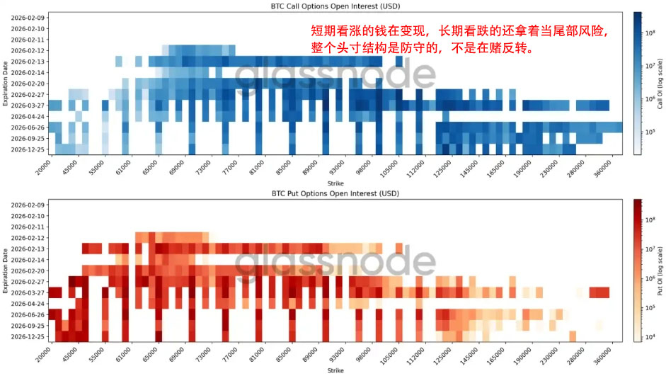 热力图更直白:2月到期,6万-7万是最大的买单;年末甚至更远的合约,5万到3万之间买单铺满一整条线。这不是在赌反转,是在铺保护。