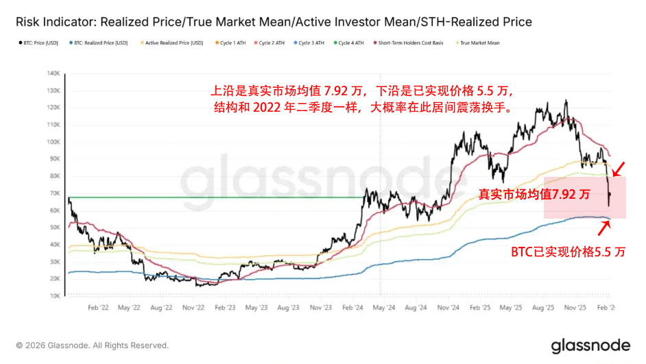 比特币现在被夹在真实市场均值7.92万和已实现价格5.5万之间,像一个被按在水里的人,脑袋偶尔露出水面喘口气,但身子还在往下沉。