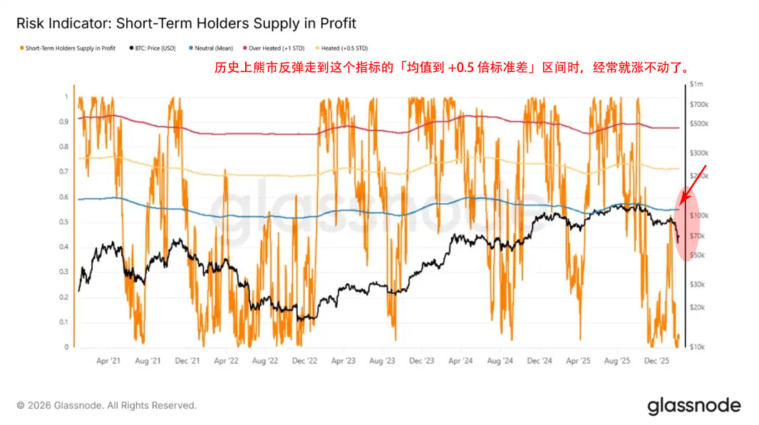 更麻烦的是短期持有者——这帮人目前盈利比例只有4.9%。历史上熊市反弹的高点,往往出现在这个指标跑到“均值到+0.5倍标准差”区间的时候。现在连盈利的人都没有,说明新钱根本不敢进场,反弹能走多远?