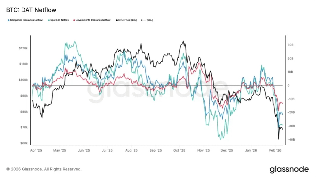 先说ETF。总资产净值从去年10月高点的1700亿美金,跌到现在的828亿。半年不到,腰斩不止。企业持仓在减。政府钱包在动。Crypto fund上周又是净流出。真正的信号不是流出比例,是流出持续性。 不是某一类资金在轮动,是三类机构同时按下暂停键。