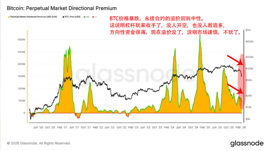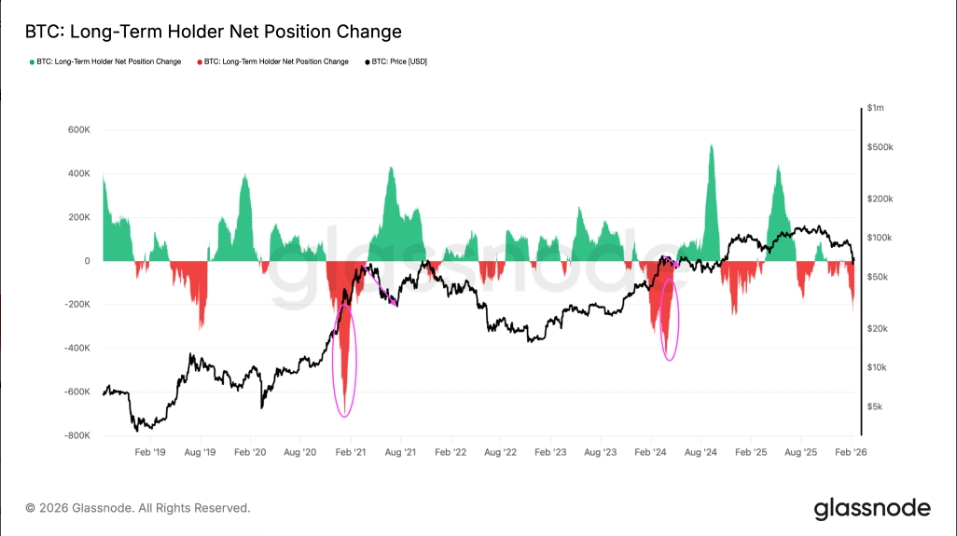 真正把价格摁在地上摩擦的,是长期持有者。BTC长期持有者净头寸变化,2月6号单日干了24.5万枚的减持,这是周期极值。——这个量级上一次出现是2019年和2021年中的调整阶段。你猜后来价格怎么走的?盘整,然后继续往下探。你要知道,这帮人是“聪明钱”的代名词,这帮聪明钱现在正忙着锁仓、对冲、降风险敞口,他们动手,从来不是调仓,是撤退。