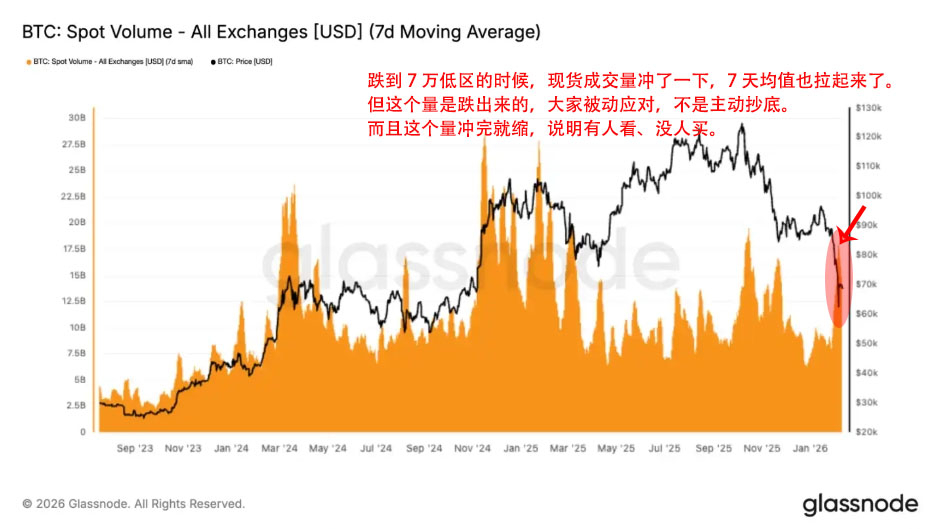 跌到7万低区那一下,成交量确实放大了。但这个量是“吓出来的”,不是“买出来的”。7天均值拉起来,冲完就缩,说明什么?有人看,没人买。 挂单薄、承接弱、被动应对——这不是积累,是换手。