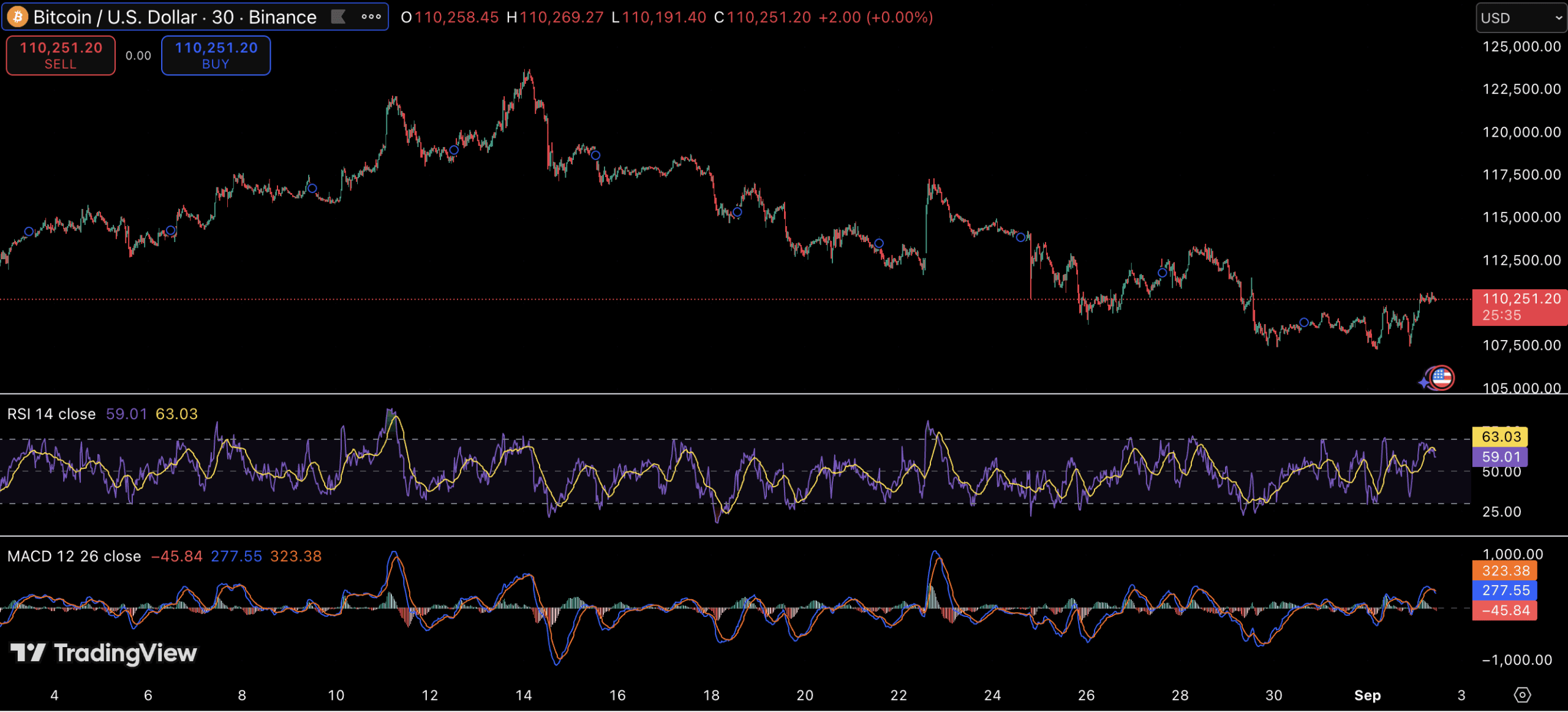 Al momento della stampa, Bitcoin viene scambiato intorno a $110,250, mantenendosi appena sopra un livello di supporto chiave di $104,000. Gli indicatori tecnici mostrano segnali misti:
