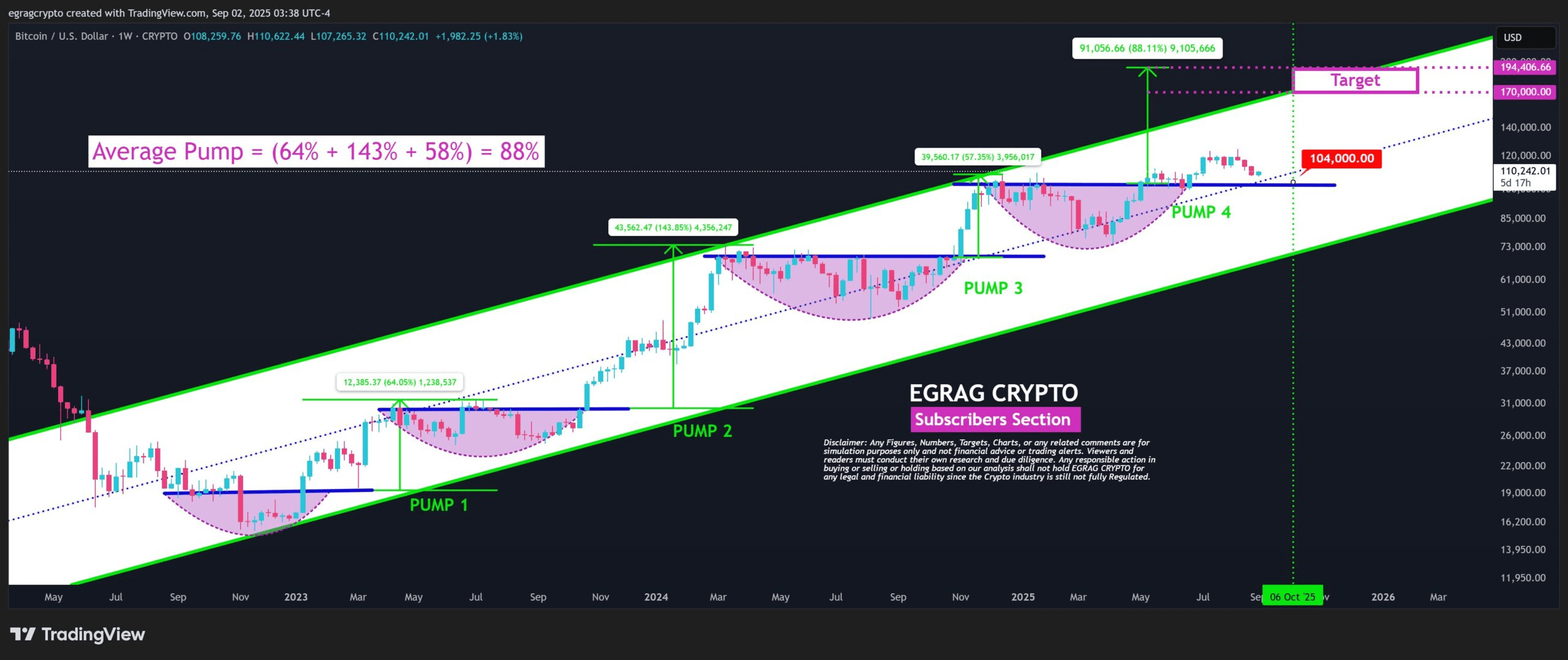 Secondo il modello di grafico di EGRAG, i “pump” storici di Bitcoin all'interno del canale ascendente hanno avuto un guadagno medio di quasi l'88%. I precedenti aumenti includevano movimenti del 64%, 143% e 58%. Se lo stesso schema si ripete, il prossimo movimento rialzista potrebbe spingere BTC nell'intervallo di $175,000–$200,000, segnando il limite superiore del suo canale rialzista a lungo termine.