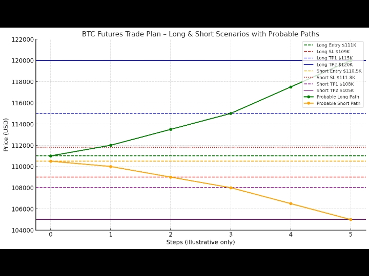 Long sopra $111K → SL $109K, TP1 $115K, TP2 $120K.