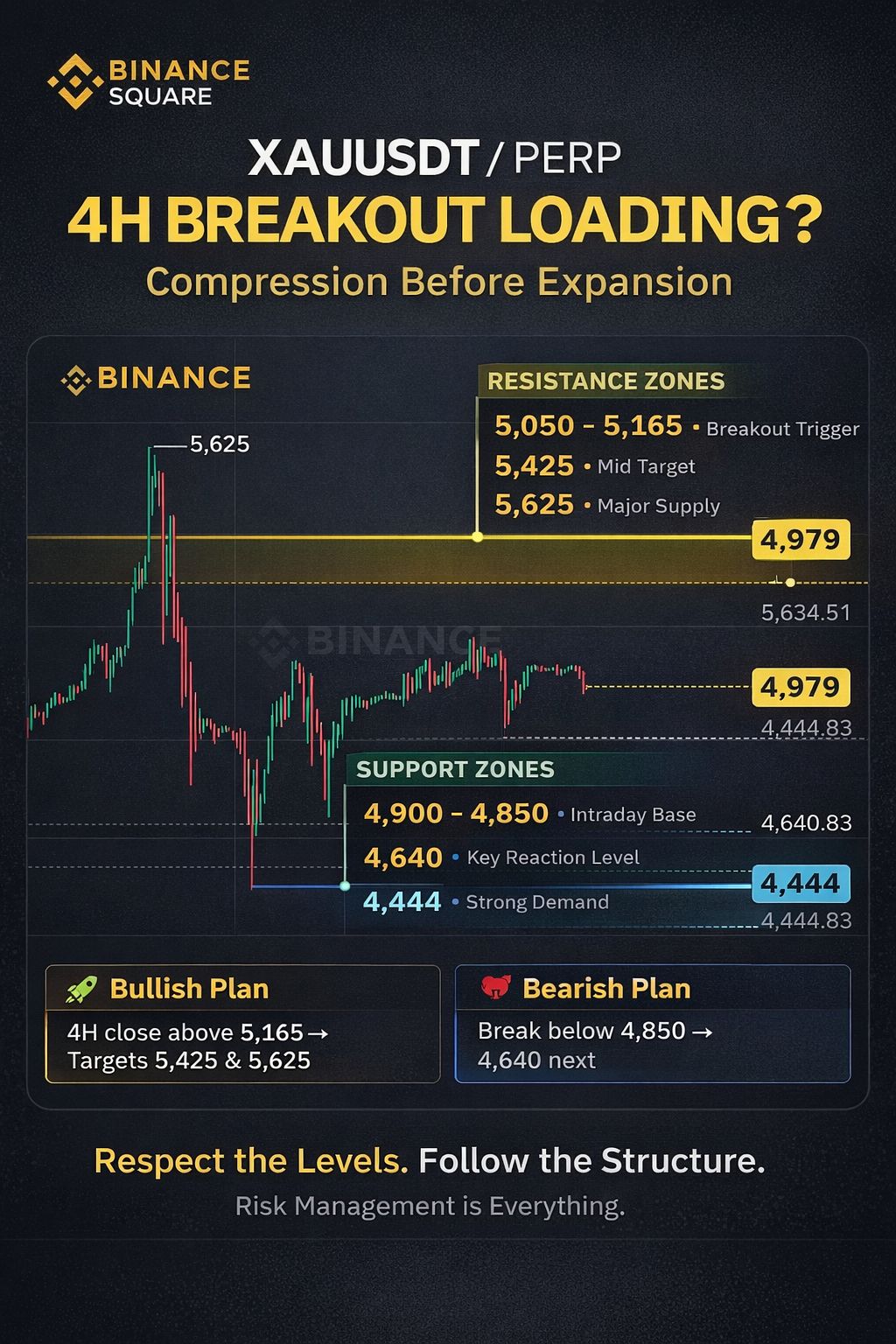 $XAU XAUUSDT is currently trading near 4,979, consolidating after a sharp rejection from the 5,625 swing high and strong bounce from the 4,444 demand zone. On the 4H timeframe, price is forming a tight range just below minor resistance, indicating a potential breakout setup. Momentum has cooled, but structure remains bullish as long as higher lows continue to hold above the 4,900 region. Volume contraction suggests a volatility expansion move is approaching.