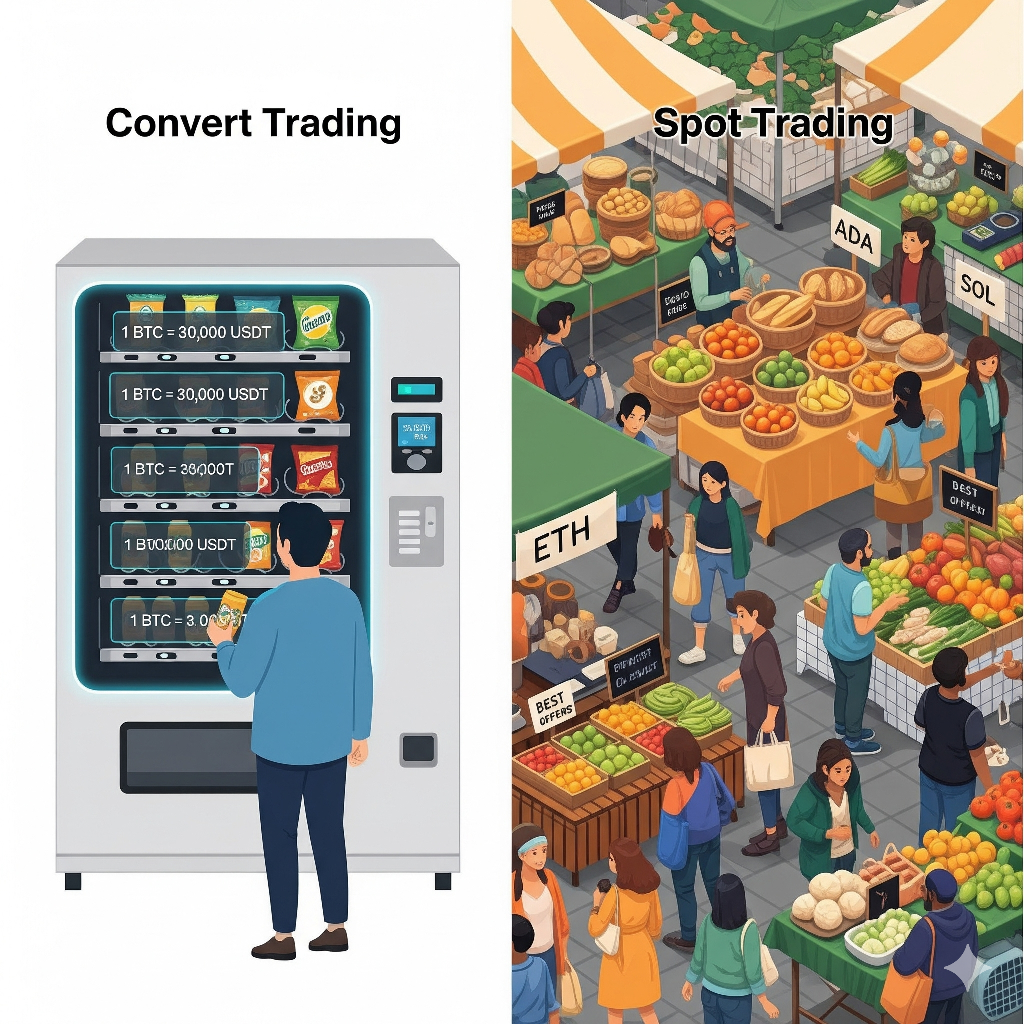 La conversione commerciale, al contrario, è una transazione diretta, over-the-counter, tra te e l'exchange stesso. È come un banco di cambio di valute digitali in un aeroporto. Ti avvicini, dici al commesso che vuoi scambiare il tuo Bitcoin per Ethereum e ti danno una quotazione immediata e ferma basata sul prezzo di mercato attuale. Non devi aspettare che un ordine venga abbinato o navigare in un'interfaccia complessa. Il commercio viene eseguito immediatamente e i nuovi asset appaiono nel tuo portafoglio. Il prezzo che vedi è il prezzo che ottieni.