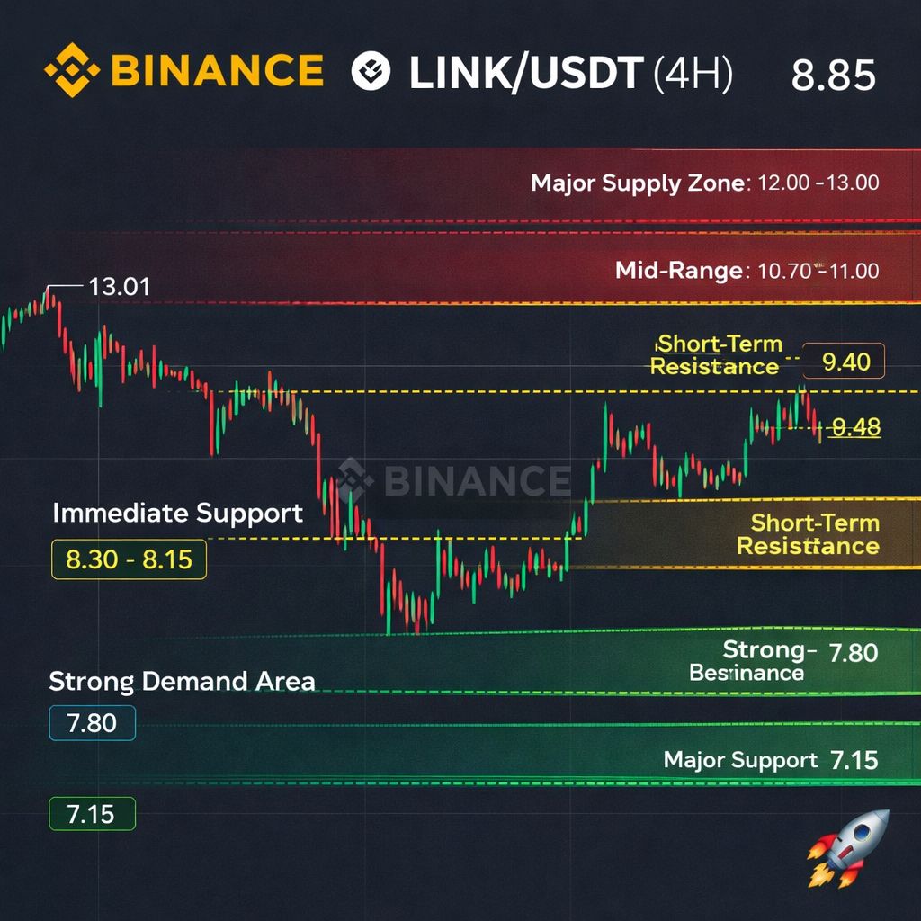 $LINK is currently trading around 8.85 USDT, attempting recovery after a sharp decline from the 13.01 swing high down to the 7.15 major low. The 4H structure shows a clear downtrend followed by base formation near 7.15, where strong buying pressure entered the market. Price is now forming higher lows, indicating early signs of accumulation. If momentum continues, LINK could attempt to reclaim the 9.40 – 10.00 resistance zone, which is the first major breakout area.