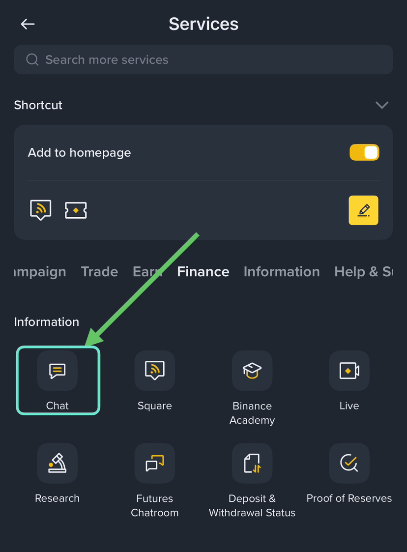 Passo 1: Vai a Servizi nella tua app Binance, poi seleziona Chat sotto la sezione Informazioni.