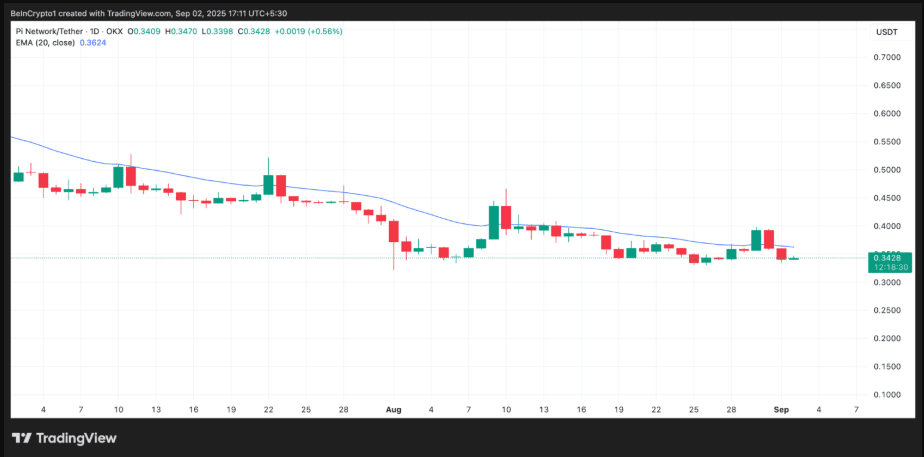 Nonostante questi sviluppi positivi, le performance di trading di PI non hanno ancora raggiunto le aspettative. Attualmente, il prezzo di questo altcoin oscilla attorno a 0,34 USD, al di sotto della media mobile esponenziale (EMA) a 20 giorni, che sta fungendo da resistenza dinamica a 0,36 USD.