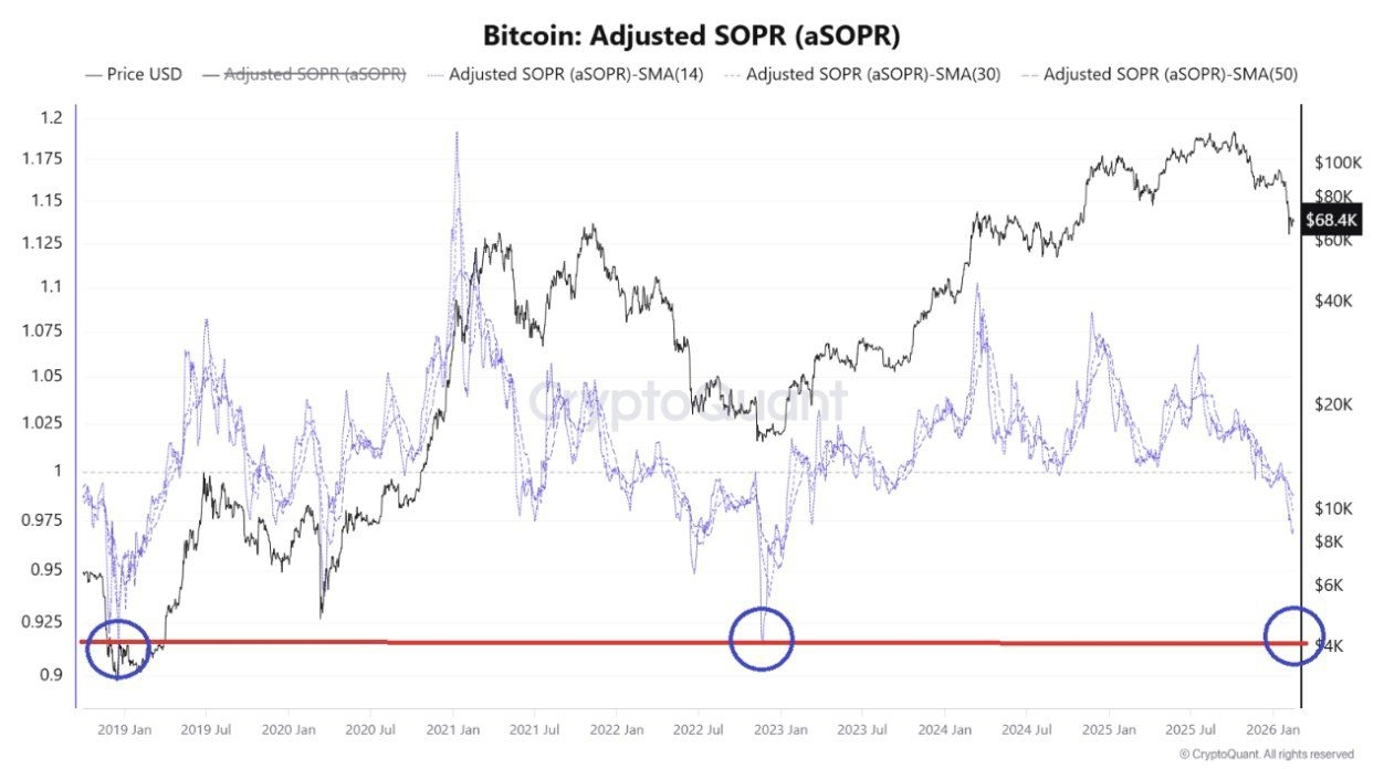 Ulteriori approfondimenti dalle analisi on-chain dipingono un quadro simile cauteloso. L'analista Woominkyu fa riferimento al Bitcoin’s adjusted Spent Output Profit Ratio (aSOPR) che si stabilizza nella fascia 0.92–0.94. Questo specifico intervallo è stato storicamente associato a pressioni intense di mercato ribassista, ricordando le significative correzioni osservate nel 2019 e nel 2023, periodi caratterizzati da vendite diffuse in perdita prima della stabilizzazione del mercato. La preoccupazione si estende oltre le cifre immediate; Woominkyu sostiene che la struttura attuale del mercato potrebbe indicare un cambiamento più profondo piuttosto che una correzione di mercato tipica. Un fallimento dell'aSOPR nel riprendere rapidamente la soglia di 1.0 potrebbe segnalare una fase ribassista prolungata, andando oltre un semplice shakeout di detentori più deboli.