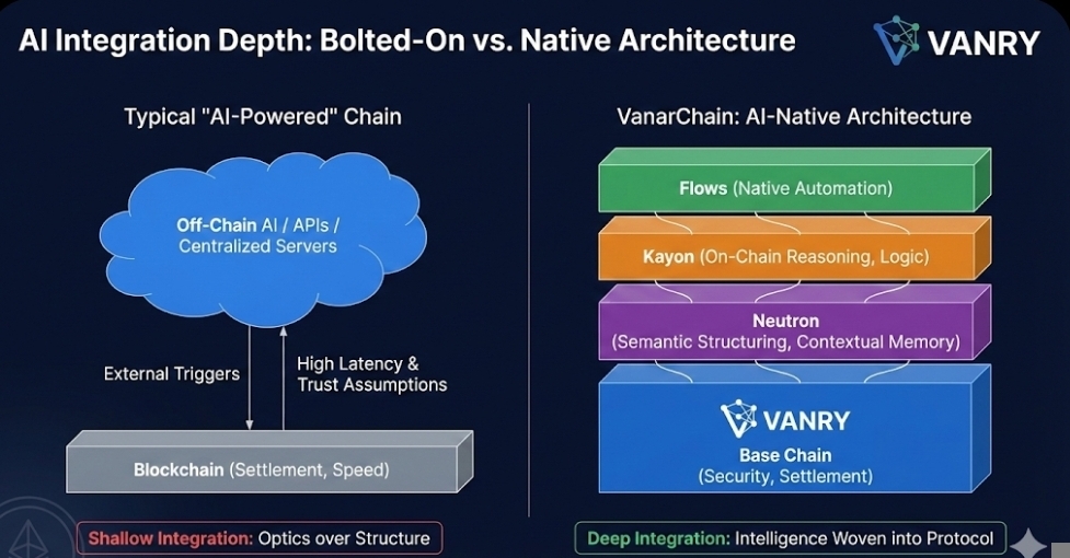 Right now the market is crowded with chains claiming AI alignment. If you scroll through announcements on X, including updates from VanarChain, you’ll see the same words repeated everywhere else too. AI integration. Intelligent automation. Agent-ready systems. But when I look underneath, most of it comes down to one of three things. Hosting AI models off-chain. Using oracles to fetch AI outputs. Or letting smart contracts trigger AI APIs. None of that changes the foundation of how the chain itself handles data.