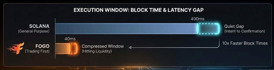 But Fogo is pushing a different angle. Early technical disclosures suggest block times closer to 40 milliseconds. That’s roughly ten times faster than Solana’s 400 milliseconds. On the surface, that sounds incremental. Underneath, it changes how order books feel. A 40 millisecond block time compresses the window between intent and settlement. In high frequency terms, that gap is the difference between hitting liquidity and chasing it.
