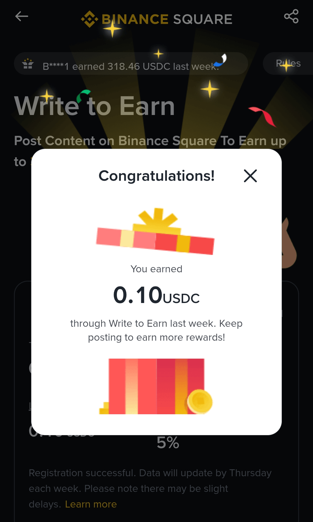 La settimana scorsa, il mio post su Binance Square ha ricevuto circa 900 – 1000 visualizzazioni, e ho guadagnato 0.10 USDC come ricompensa.