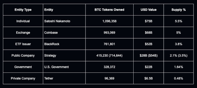 Satoshi Nakamoto: Rimane il maggiore holder con 1,096,358 BTC (~$75B), un fantasma che possiede il 5.5% della rete.