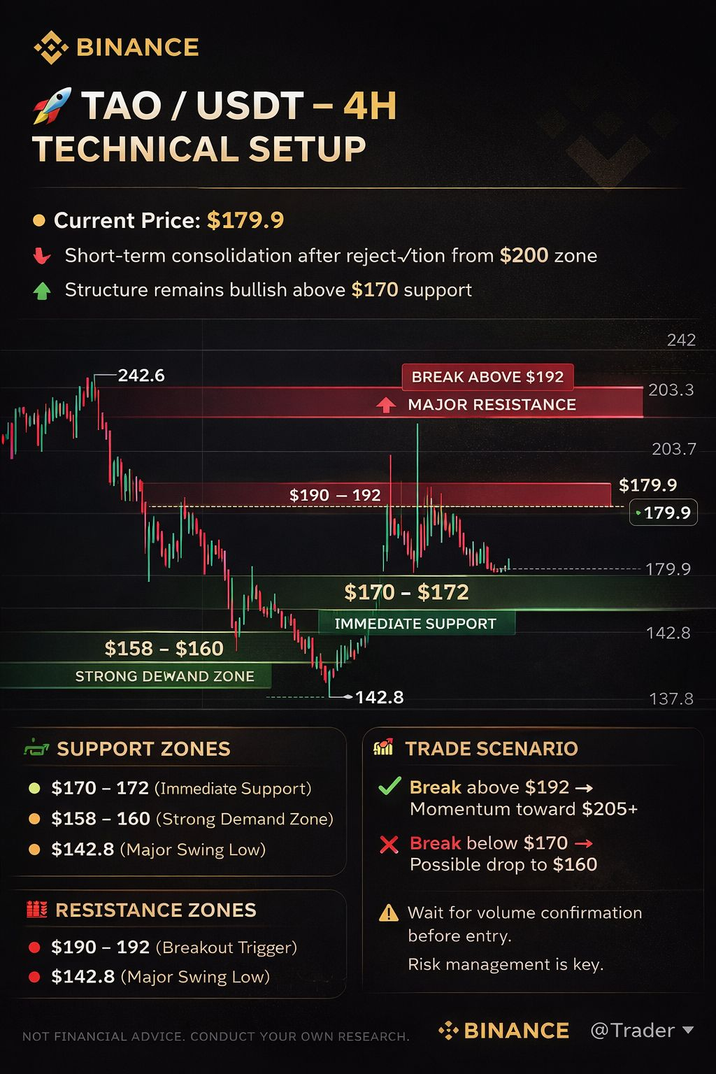 $TAO is currently trading around $179.9 after facing rejection near the $200 psychological resistance zone. The chart shows a strong recovery from the $142.8 major swing low, followed by a sharp impulsive move upward — indicating buyers are still active on dips. However, recent candles show consolidation with lower highs, suggesting short-term bearish pressure.