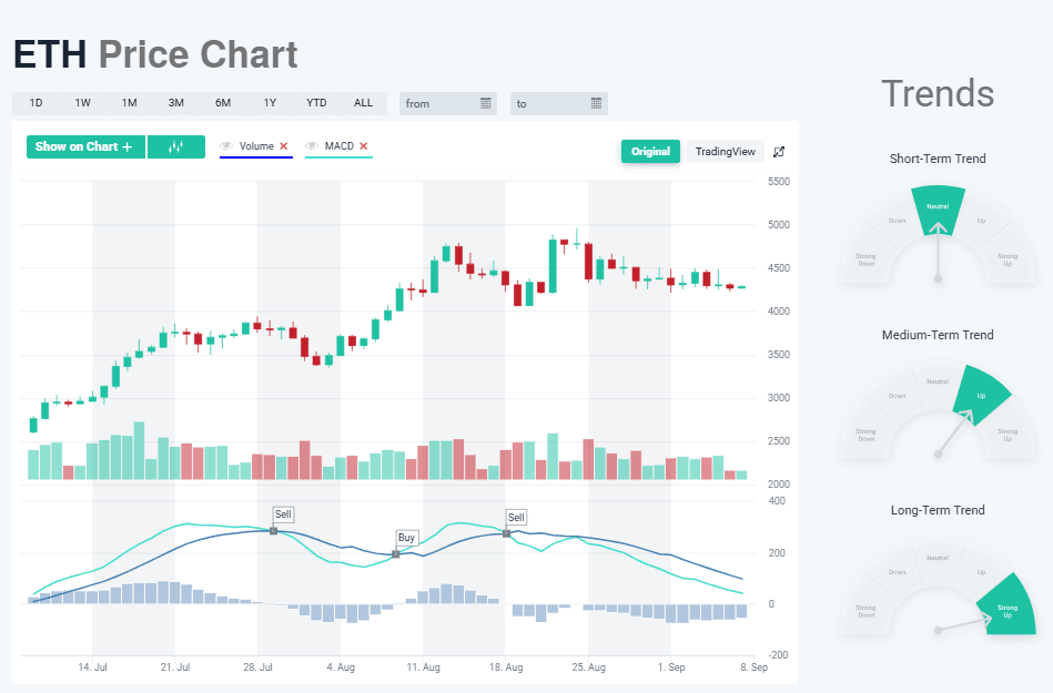 Nel grafico a un giorno, ETH sta mostrando una fase di consolidamento dopo il recente rialzo, con il prezzo attualmente in movimento nell'intervallo $4.000–$4.500. Le candele riflettono indecisione: corpi più piccoli e volatilità ridotta rispetto al forte slancio al rialzo di luglio-agosto. Questo suggerisce che il mercato sta facendo una pausa, in attesa di un chiaro segnale prima del prossimo grande movimento.