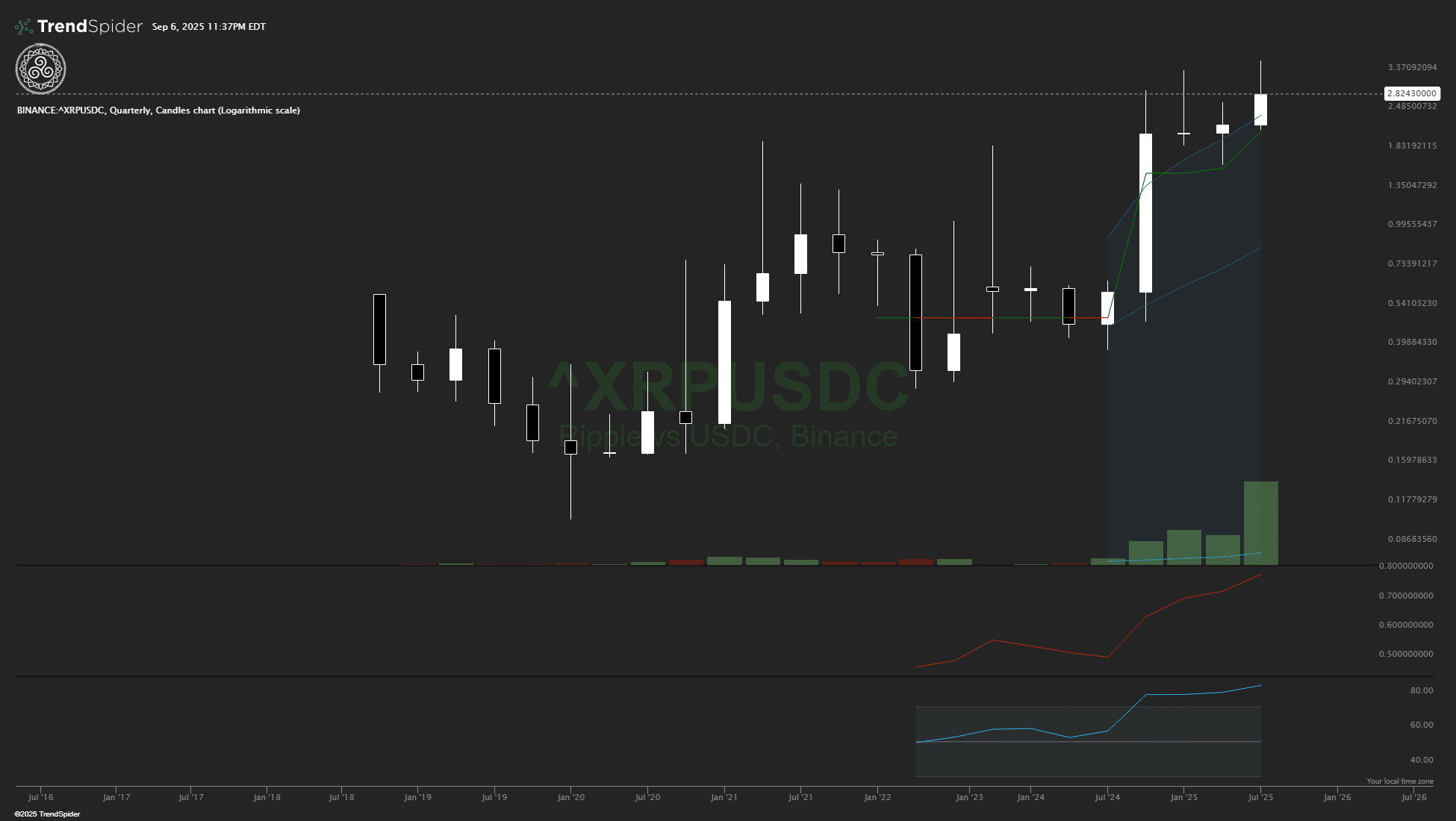Il grafico trimestrale per XRP conferma la tua osservazione - stiamo assistendo a un classico breakout delle bande di Bollinger su questo lungo intervallo di tempo con RSI a 82, che indica un momento estremamente forte. La candela trimestrale si è chiusa significativamente sopra la banda superiore, è tornata indietro per testarla ed ora sta spingendo di nuovo verso l'alto. Questo è esattamente il tipo di modello che ha preceduto importanti mercati rialzisti di diversi anni in altri asset.