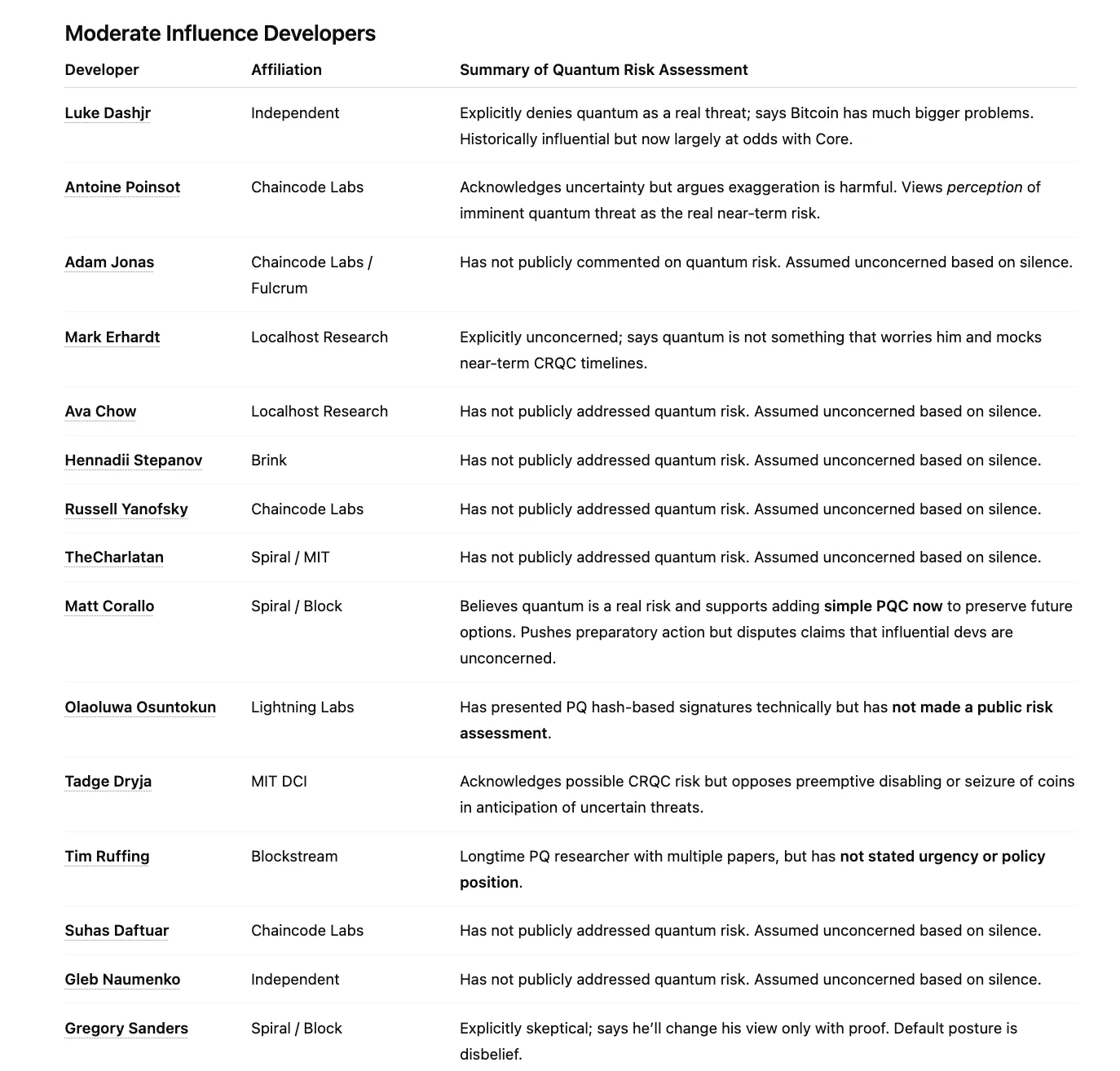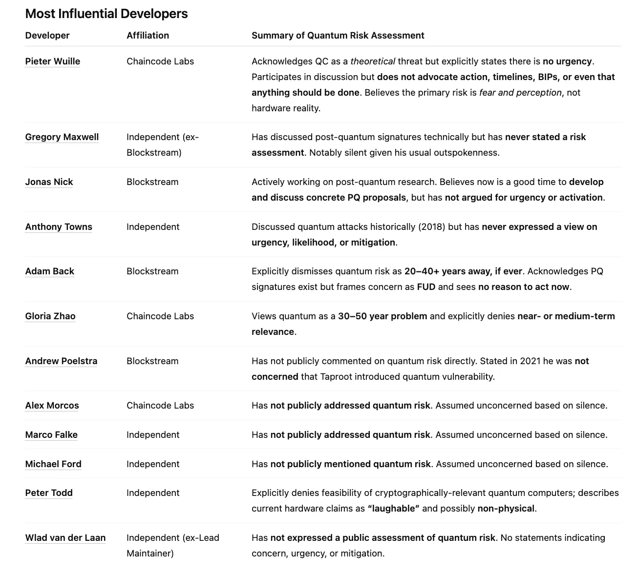 In generale, la maggior parte degli sviluppatori di Bitcoin più influenti non ha mai nemmeno riconosciuto il rischio quantistico. Pochi che riconoscono il rischio (escluso Jonas Nick) lo considerano generalmente teorico, lontano o non praticabile. Peter Todd e Adam Back negano esplicitamente il rischio. Pieter Wuille riconosce che il problema esiste, partecipa alla discussione, ma dichiara chiaramente che non è un rischio o una priorità attuale.