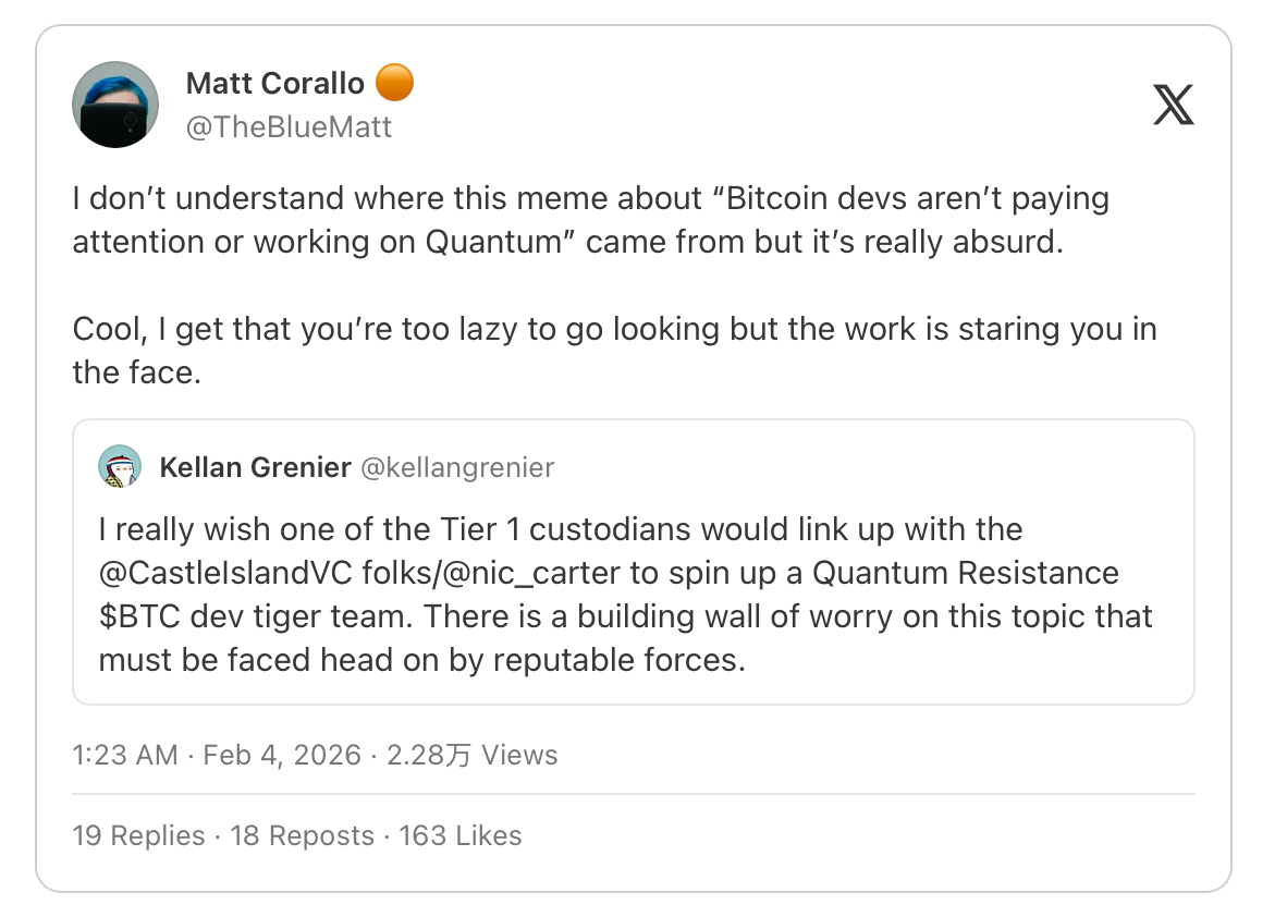 Non lasciarti ingannare dalle dichiarazioni di Adam Back o Matt Corallo. Tra i più influenti sviluppatori di Bitcoin, esiste effettivamente una patologia di indifferenza. Sebbene ci siano alcuni punti luminosi, nel complesso, la migrazione quantistica non è chiaramente una priorità per Bitcoin Core e le sue principali istituzioni di sviluppo.