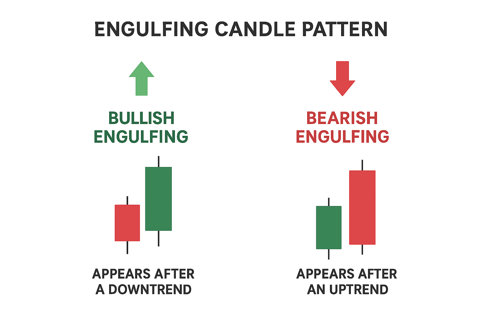 Il modello di candela Engulfing è un forte segnale di inversione nel trading delle candele. Si verifica quando una nuova candela copre completamente (o inghiotte) quella precedente. Questo mostra un improvviso cambiamento nel momentum di mercato.