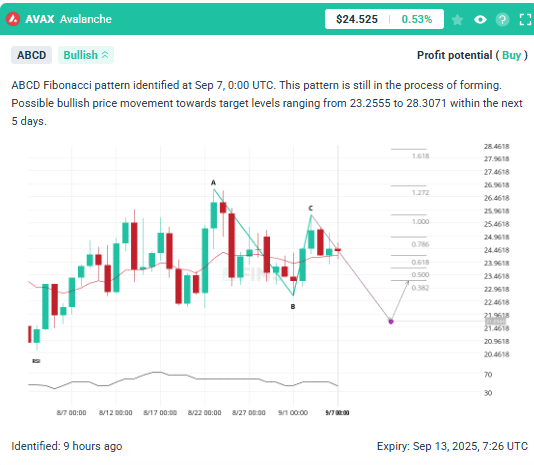 Il secondo grafico rivela un modello Fibonacci ABCD, identificato solo poche ore fa, che punta verso un movimento rialzista. La proiezione suggerisce che dopo un piccolo calo correttivo, AVAX potrebbe salire nell'intervallo $23.25 – $28.30 entro i prossimi cinque giorni. Questo si allinea con i precedenti punti di resistenza sul grafico e rafforza la prospettiva di acquisto.