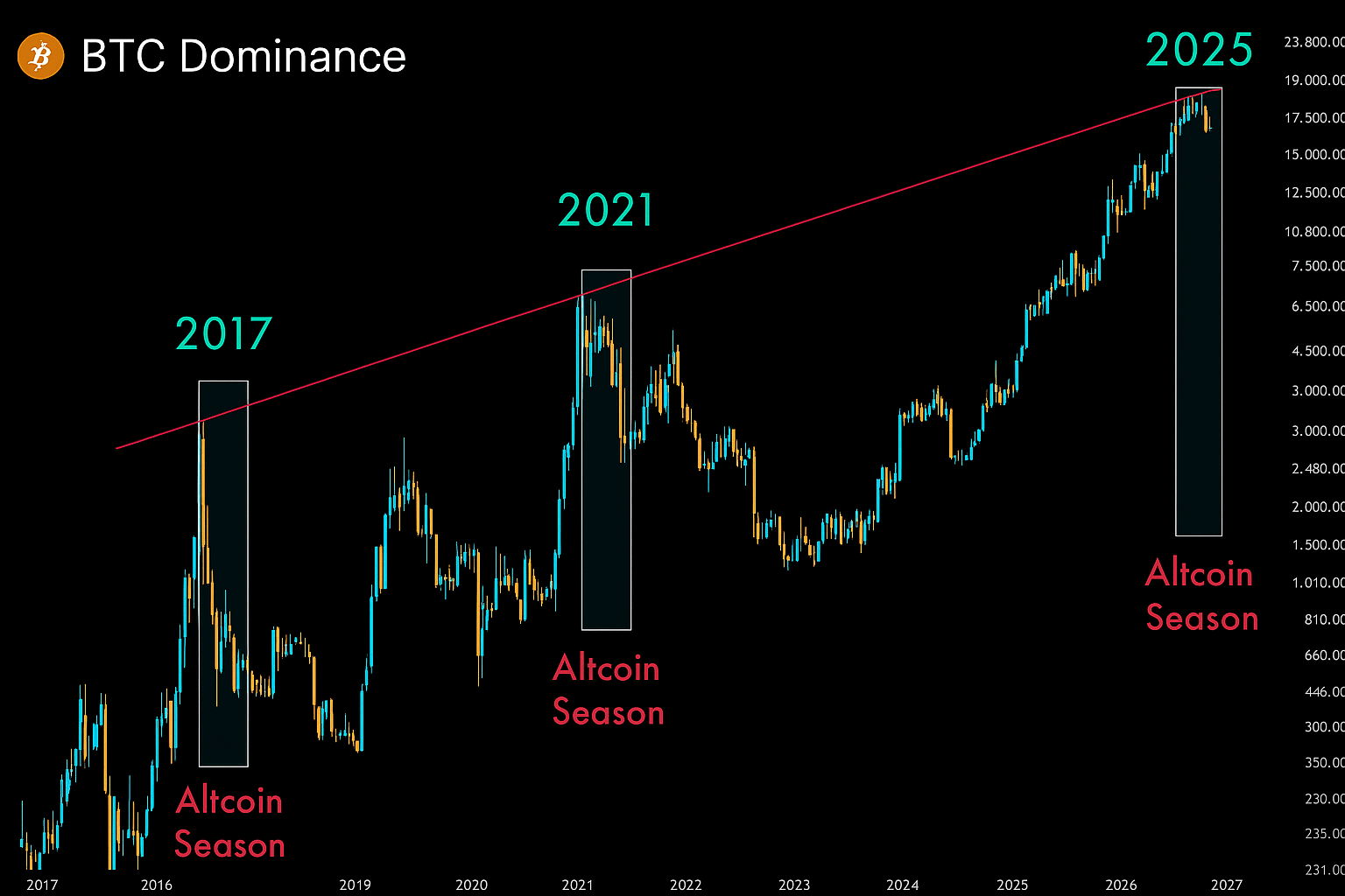 Ora, nel 2025, il grafico sta dipingendo la stessa immagine: dominanza di BTC al picco e altcoin pronti per la loro corsa più grande.