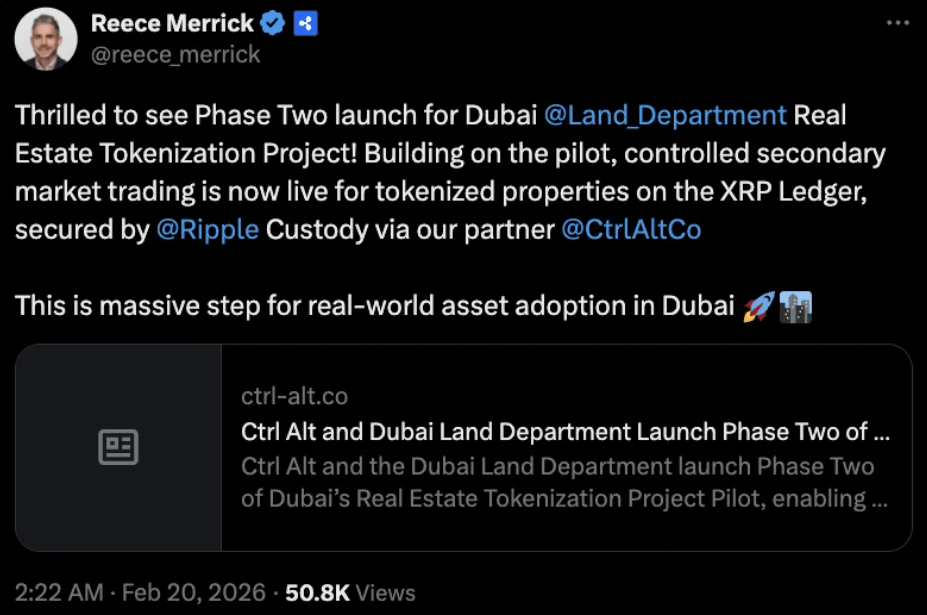 Secondo Ctrl Alt, tutte le transazioni onchain per i token immobiliari saranno registrate sul XRP Ledger e protette da Ripple Custody.