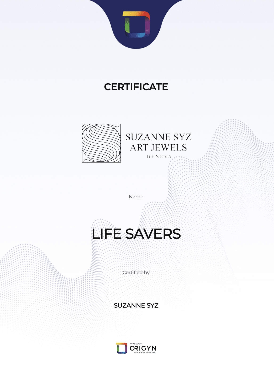 Una famosa collezione di alta gioielleria creata dall'artista svizzero Suzanne Syz, certificata da ORIGYN, con una completa provenienza on-chain e valutazione da esperti.