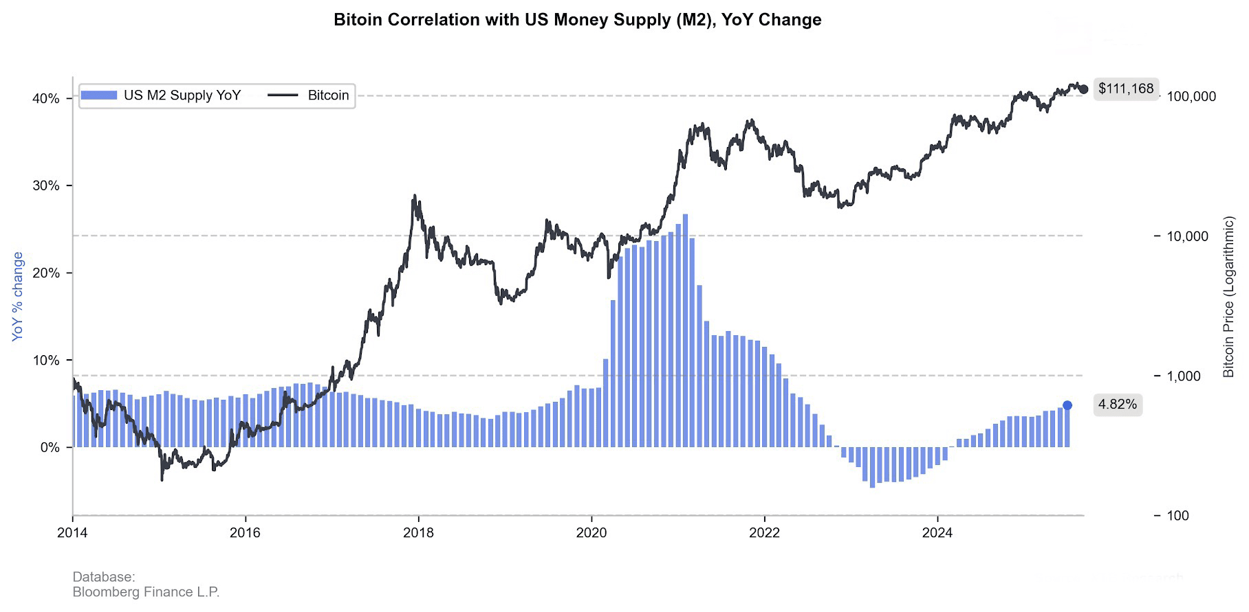 La massa monetaria (M2) nei bilanci delle principali banche centrali sta crescendo, sostenendo l'oro e — con un leggero ritardo — ci si aspetta che sostenga anche il BTC.