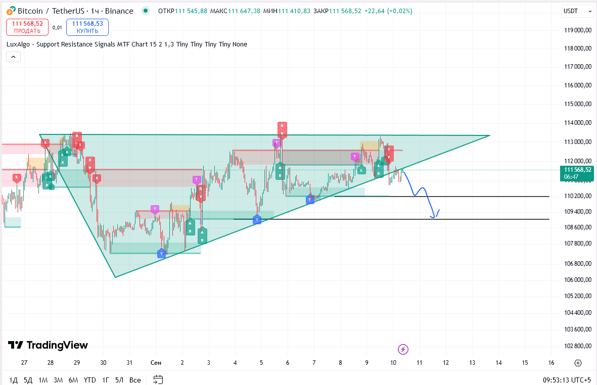 Questo è un forte segnale ribassista, e ora lo scenario più probabile è una caduta verso i livelli di $110 000 e anche $108 450. Se i compratori dovessero recuperare forze, il prezzo potrebbe tornare nell'intervallo e provare a rompere verso l'alto. In tal caso, i prossimi obiettivi di crescita saranno $115 400 e $117 150, e nel medio termine anche $125 000.