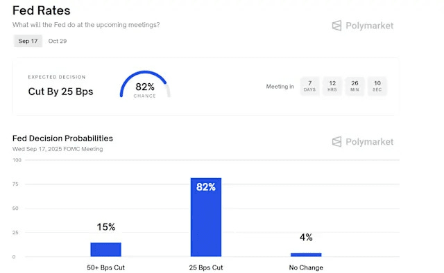 I mercati delle previsioni si stanno orientando pesantemente verso l'allentamento. I scommettitori di Polymarket assegnano una probabilità dell'82% di un taglio di 25 punti base il 17 settembre, lasciando solo poche possibilità per un movimento più profondo o nessuna modifica. Oltre a ciò, le aspettative di ottobre sono fratturate, con probabilità quasi uguali per un altro taglio o una pausa. Questa divergenza spiega perché la volatilità, sebbene assente ora, è improbabile che rimanga tale.