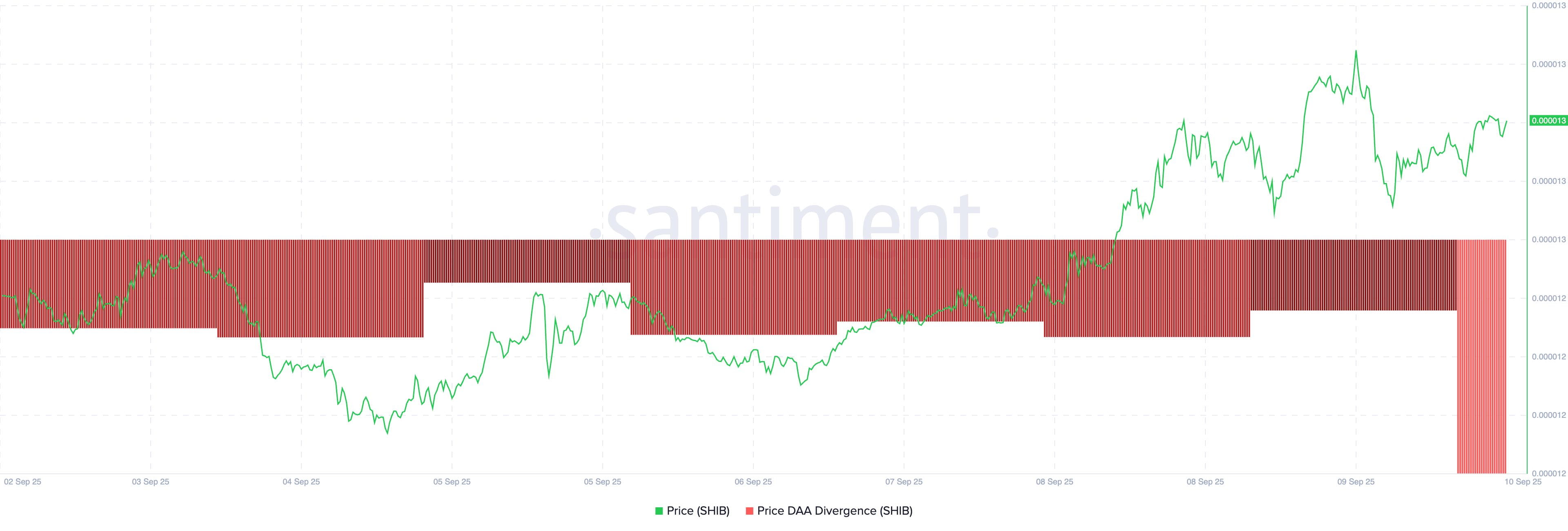 Inoltre, SHIB mostra una divergenza negativa sostenuta tra il prezzo e il numero di indirizzi attivi al giorno (DAA). Questo indica che l'attività della rete è in ritardo rispetto all' recente aumento del prezzo del token.