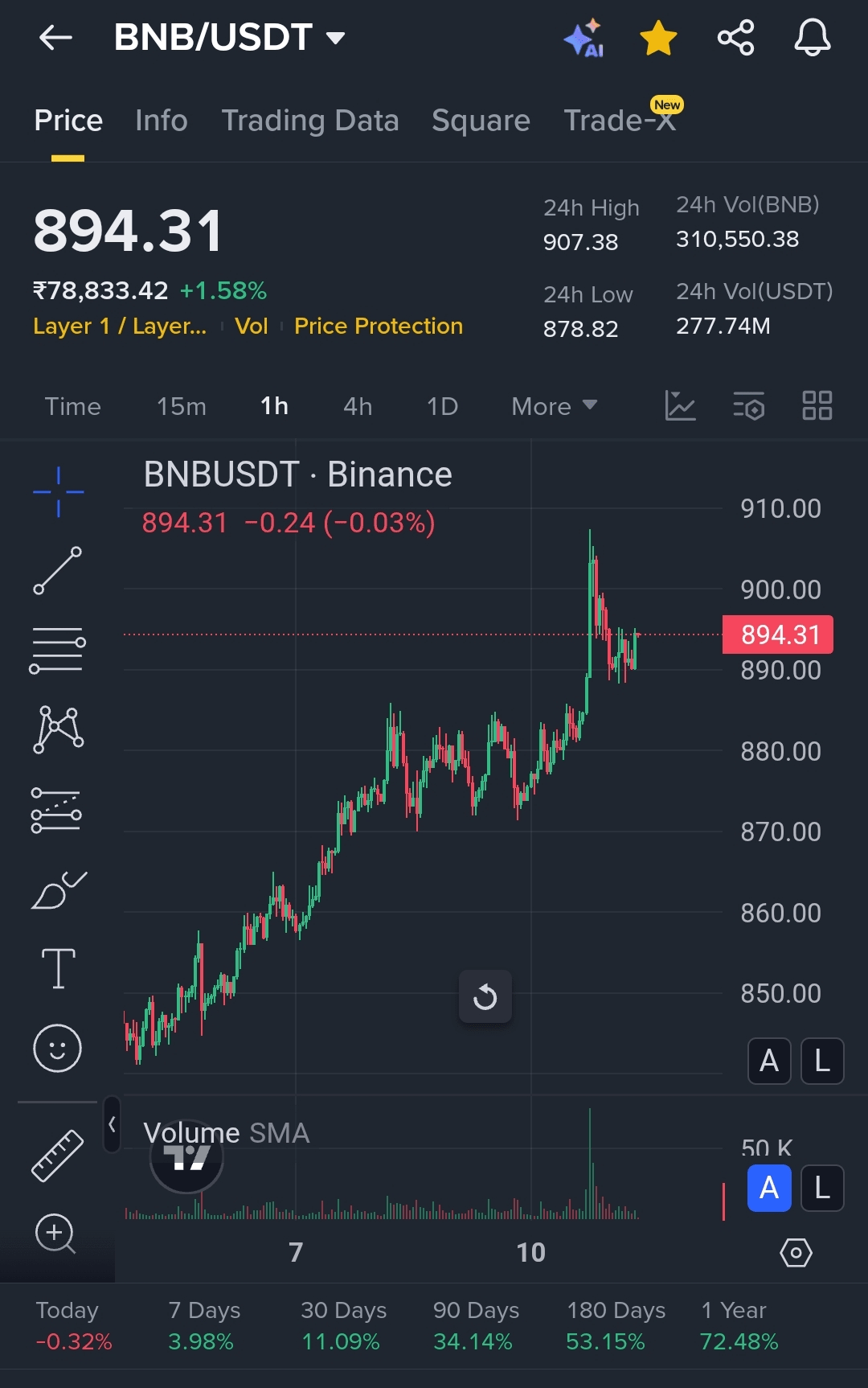 BNB ha mostrato una tendenza al rialzo costante negli ultimi giorni, rompendo più livelli di resistenza con una forte pressione d'acquisto. Dopo aver toccato $907, il prezzo ha subito un leggero ritracciamento ed ora si sta consolidando intorno a $894 – un segnale sano per la continuazione.
