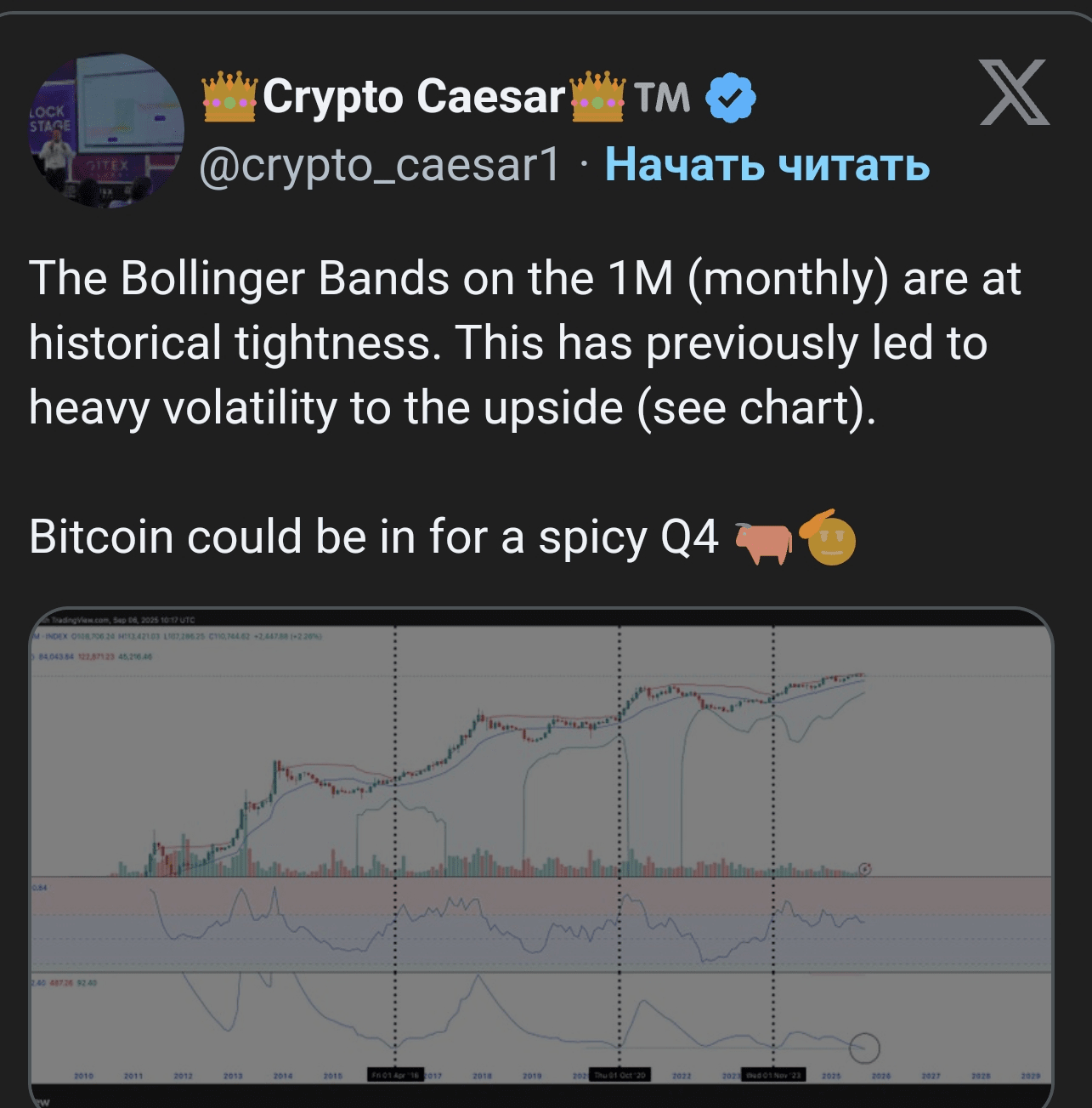 Recentemente, l'indicatore tecnico delle Bande di Bollinger (BB) sul grafico mensile del bitcoin ha raggiunto un minimo storico, segnalando l'inizio di una fase di «estrema» volatilità. Secondo gli analisti di ForkLog, le bande BB si sono ristrette a un livello che non si vedeva dall'inizio dell'esistenza $BTC , il quale storicamente precede forti movimenti di mercato. Questa compressione della volatilità, simile all'estate del 2023, potrebbe portare al più grande balzo di prezzo nella storia delle criptovalute.