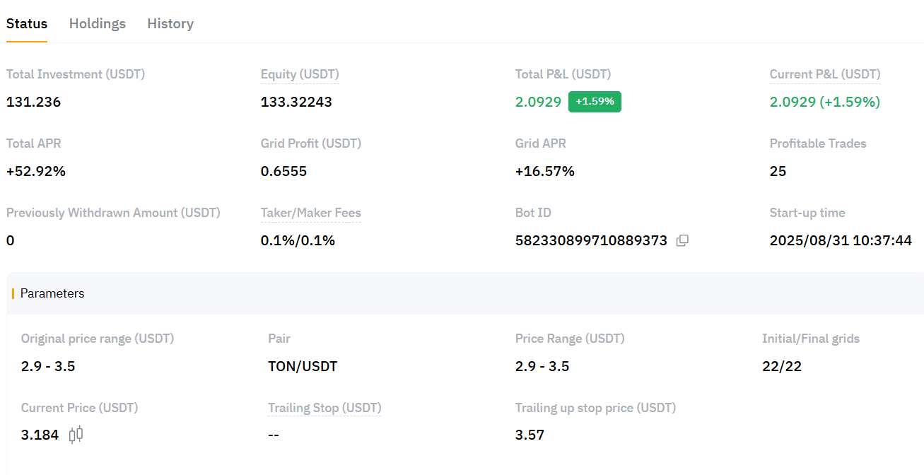 Il prezzo attuale di TON ($3.165) si trova comodamente nel mezzo della mia griglia. Se TON continua a scambiare lateralmente all'interno di questo canale, questo bot è pronto a continuare a performare costantemente. Una forte rottura di tendenza richiederebbe una rivalutazione della strategia.