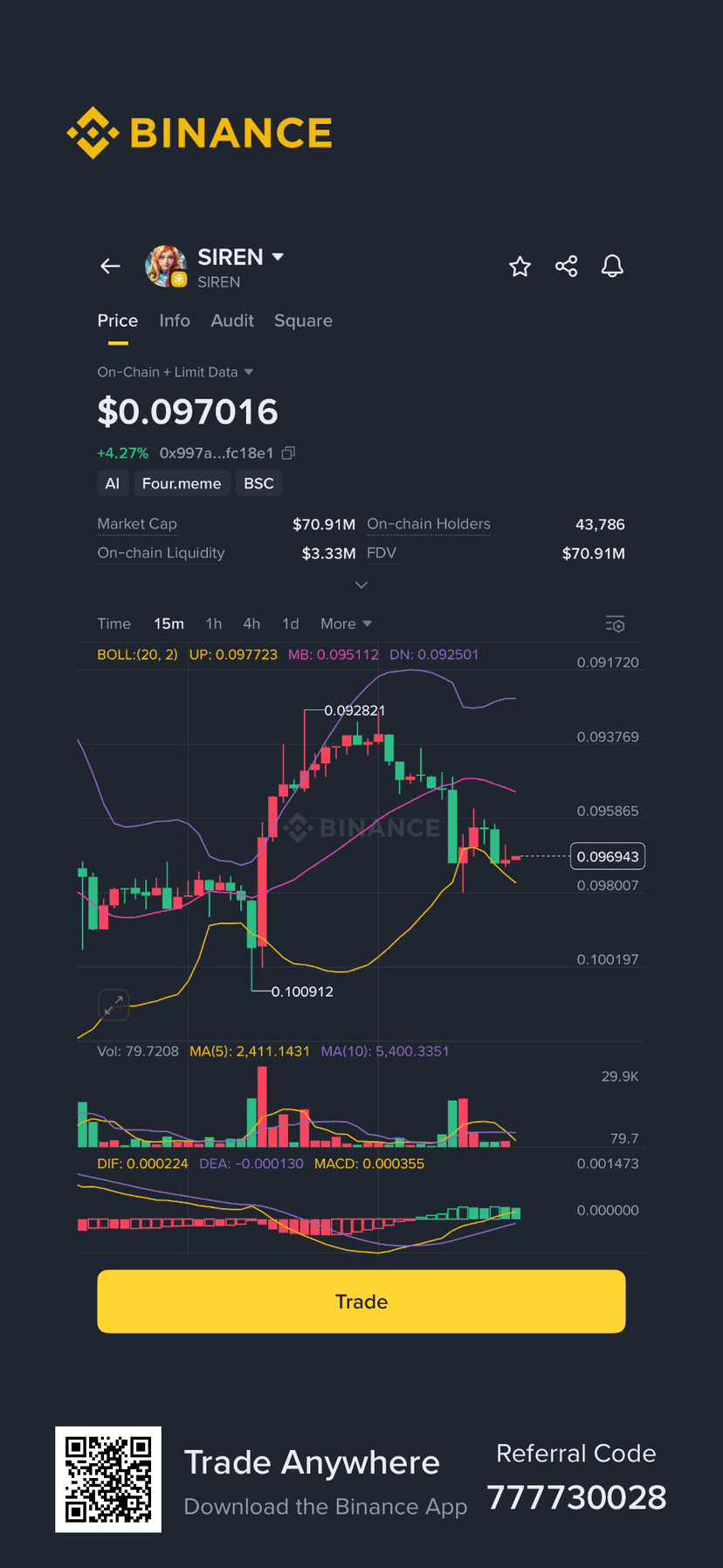 Da una prospettiva finanziaria, SIREN presenta un caso di studio intrigante. Secondo gli ultimi dati, la sua capitalizzazione di mercato è di circa 70.91 milioni. Questo lo colloca all'interno di una crescente classe di altcoin a media capitalizzazione, offrendo un equilibrio tra il potenziale di alta crescita e un certo grado di presenza di mercato consolidata. Il volume di trading nelle ultime 24 ore è di circa 3.33 milioni, indicando un livello sano di liquidità e attività di trading.