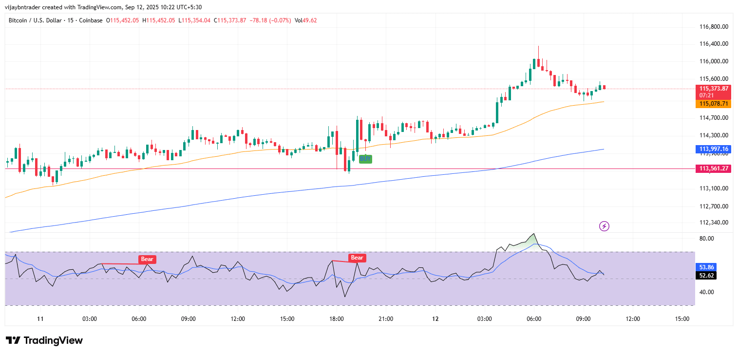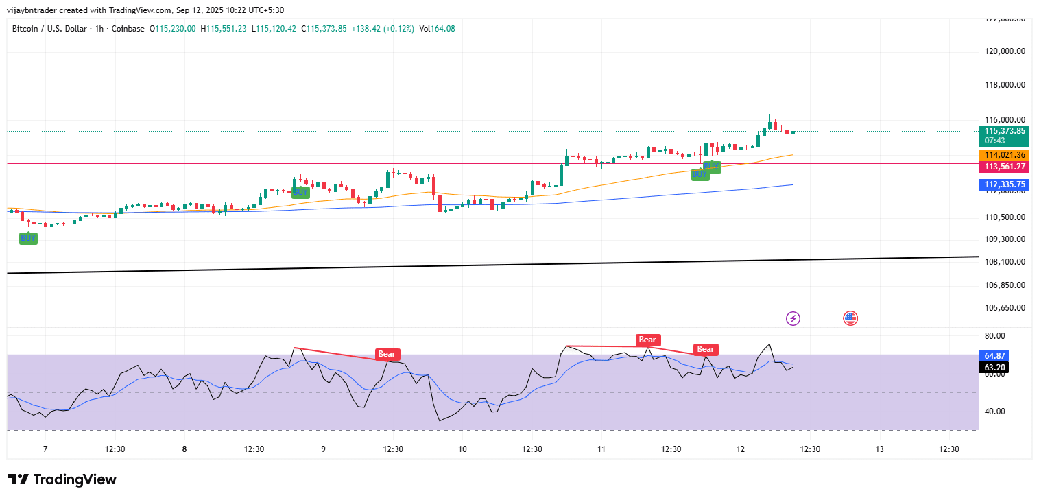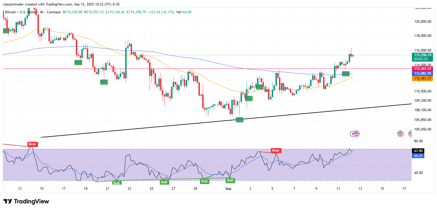 Riconoscimento del modello: breakout pulito del triangolo ascendente a 115.4K con obiettivo di movimento misurato a 116.5K già raggiunto